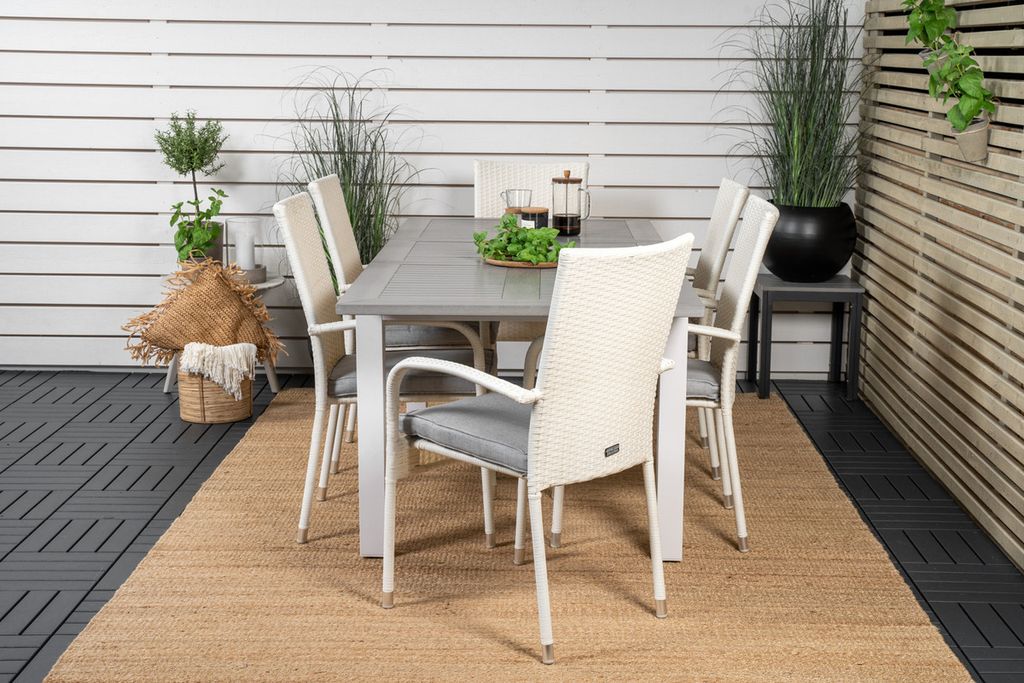 Matgrupp som passar i de flesta miljöer! Vårt förlängningsbara matbord Albany tillsammans med snygga stolar i serien Anna i vit konstrottning är som gjort för dig som vill skapa en ombonad och modern känsla i trädgården eller i uterummet. Utöka dina middagsbjudningar och slipp oroa dig över att alla ska få plats.
