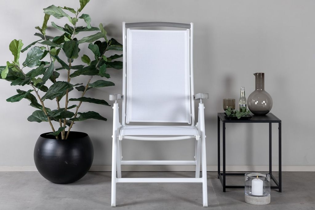 Elegant och bekväm positionsstol i vitt, perfekt för trädgård och altan. Justerbar i 5 positioner med stilfulla armstöd.