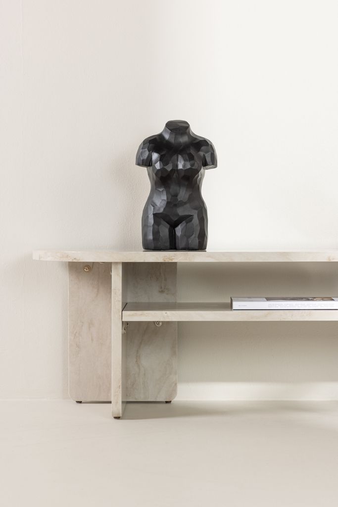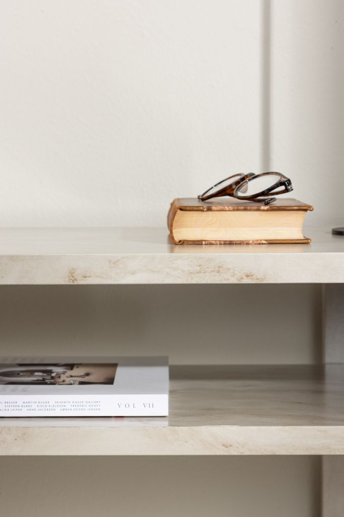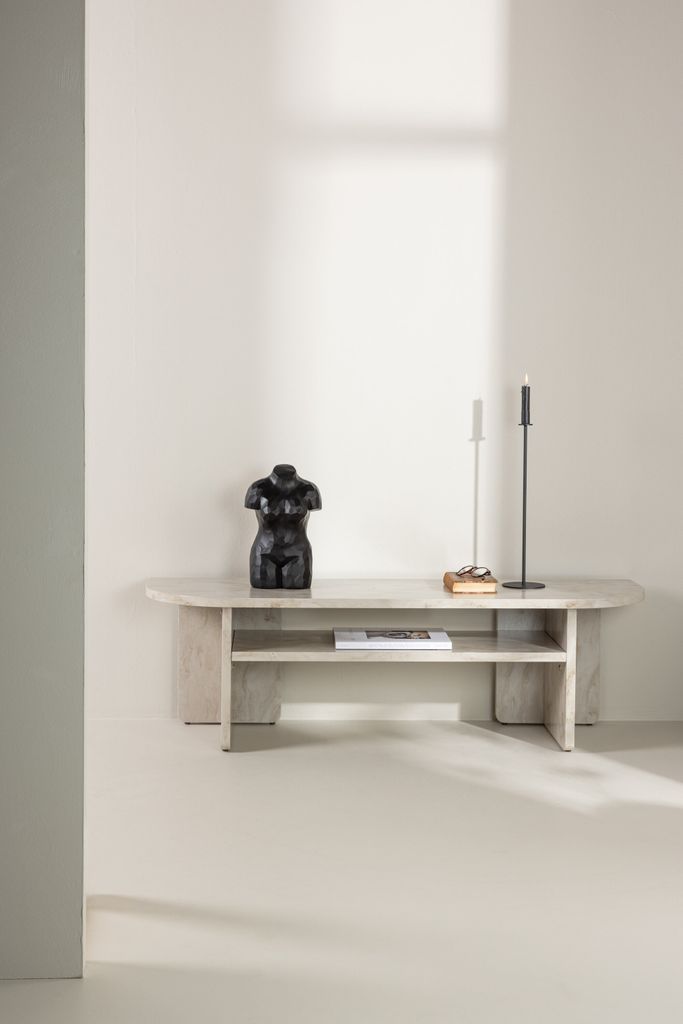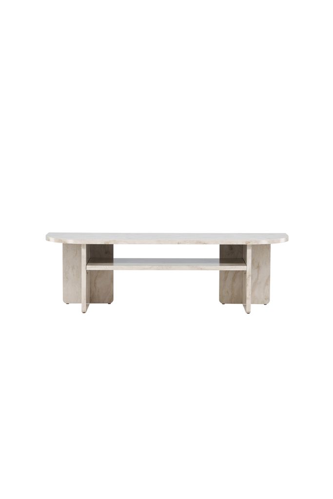 Elegant TV-bänk i marmorlook med skandinavisk design och praktisk förvaring för ditt vardagsrum.
