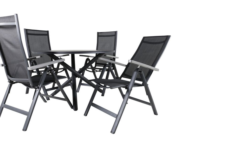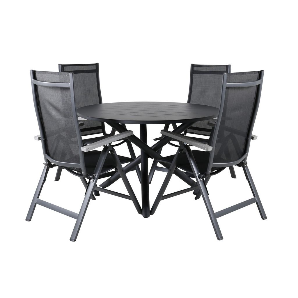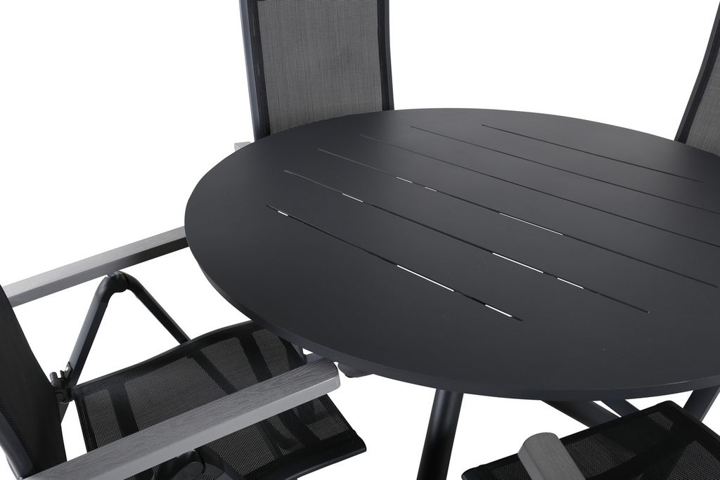 Stilrent, slitstarkt och smart! Här erbjuds du det bästa av alla världar när du kombinerar vårt runda matbord Alam i svart kulör med bekväma, justerbara stolar från serien Albany. Matbordet har en klassisk och tidlös design och i stolarna sitter du och dina gäster bekvämt i flera timmar. Skapa ett modernt blickfång på uteplatsen i sommar!