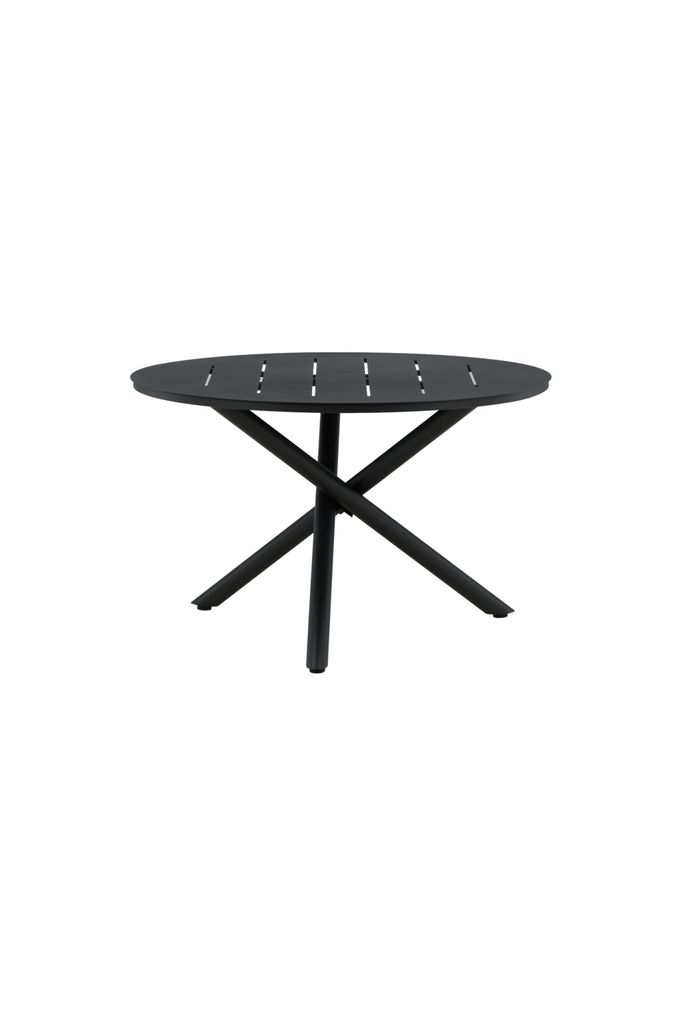 Stilrent runt matbord i svart aluminium, perfekt för både inomhus och utomhus. Elegant mittpunkt för sociala stunder.