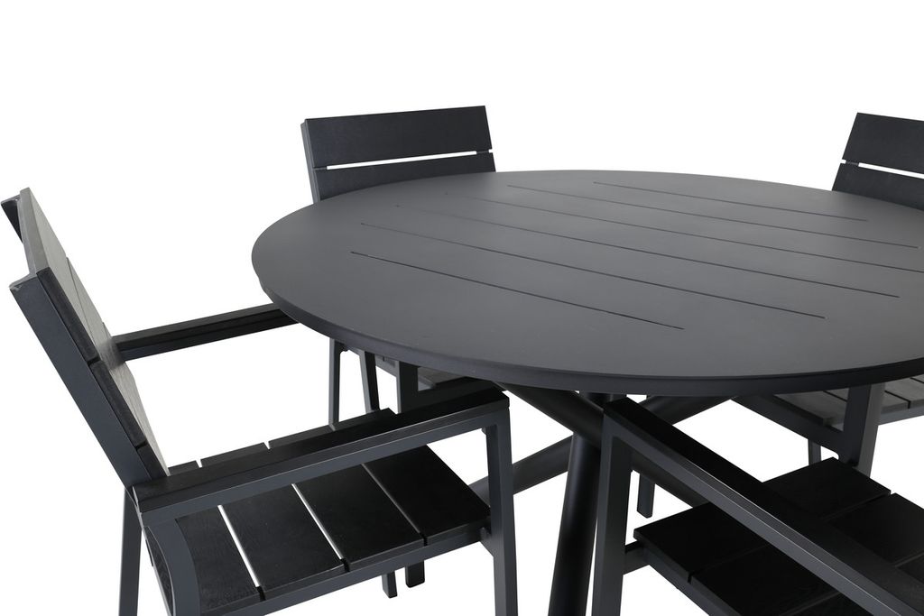 Läckert matchande matgrupp för sommarens alla måltider - passar lika bra i uterummet som på altanen! Levels är en praktisk karmstol i svart aluminium med svart sits och ryggdel i smäcker aintwood. Stolen är stapelbar, för smidig förvaring. Här tillsammans med vårt runda matbord Alma i svart aluminium. Skapa den perfekta sociala atmosfären på uteplatsen!