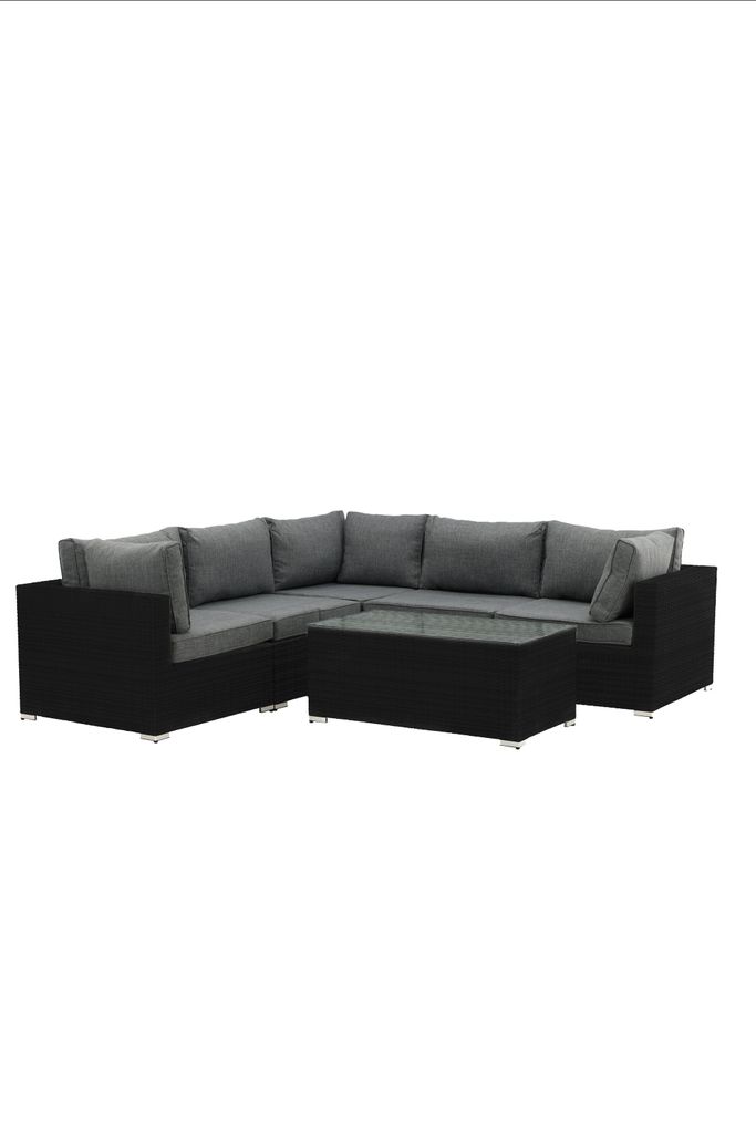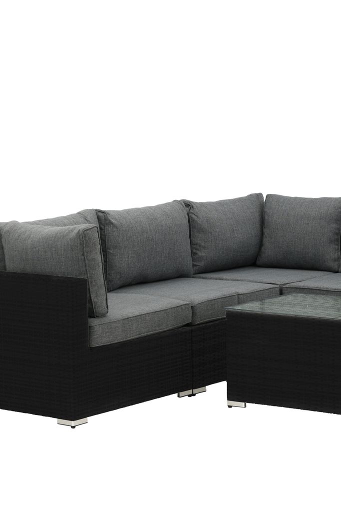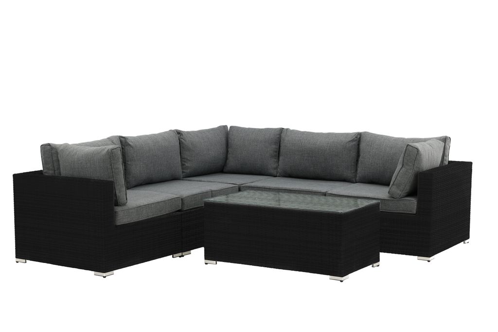Modern hörnsoffgrupp i svart konstrotting med grå dynor och glasbord, perfekt för uteplatsen.