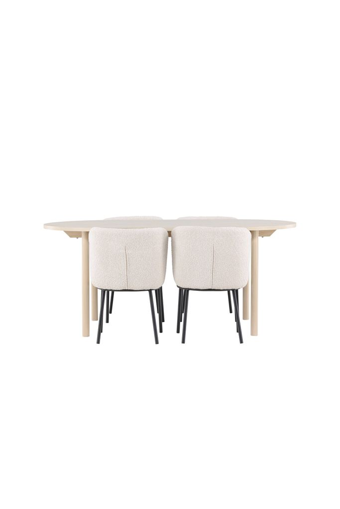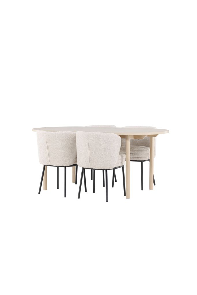 Elegant matgrupp med Andy bord i vittvättad MDF och Agnes stolar i vit bouclé. Perfekt för stilrena hem.
