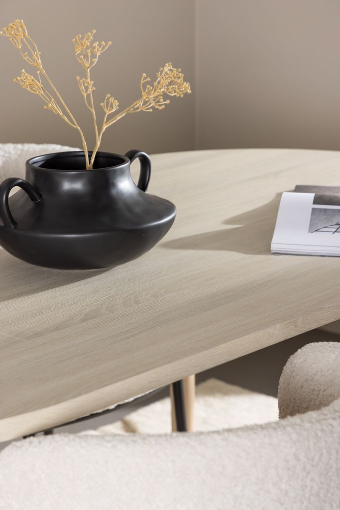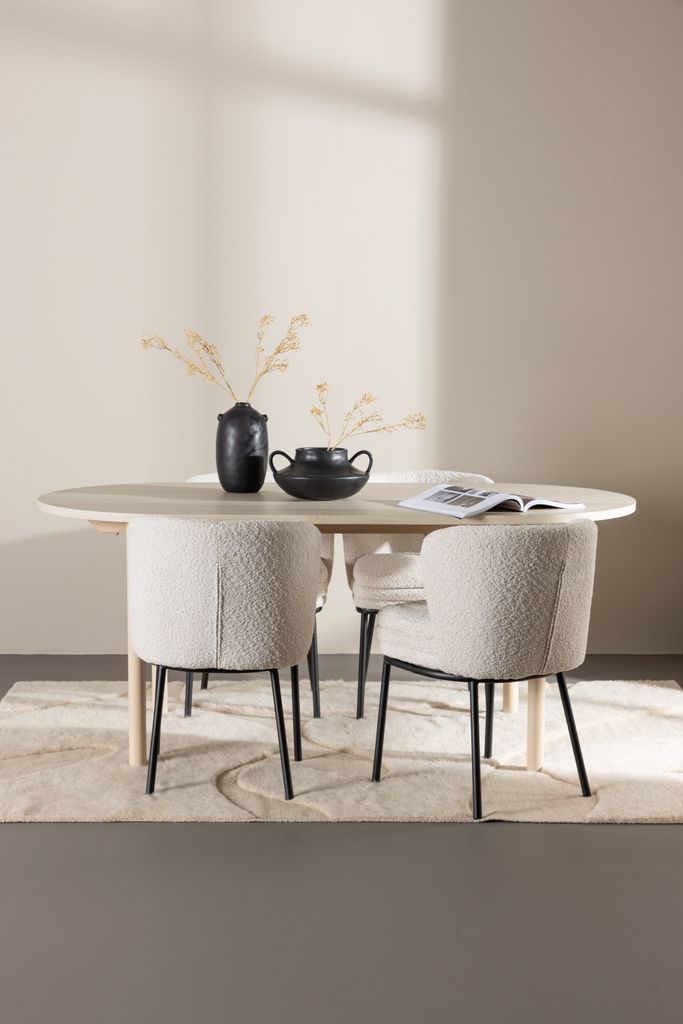 Agnes matstolar kompletterar bordet med sina vita boucléklädda sitsar och svarta stålben. Den mjuka och texturerade bouclésitsen ger en inbjudande känsla medan de eleganta stålbenen tillför en modern touch. Denna kombination av material skapar en stilren och sofistikerad estetik som lyfter ditt matsalsrum eller kök.