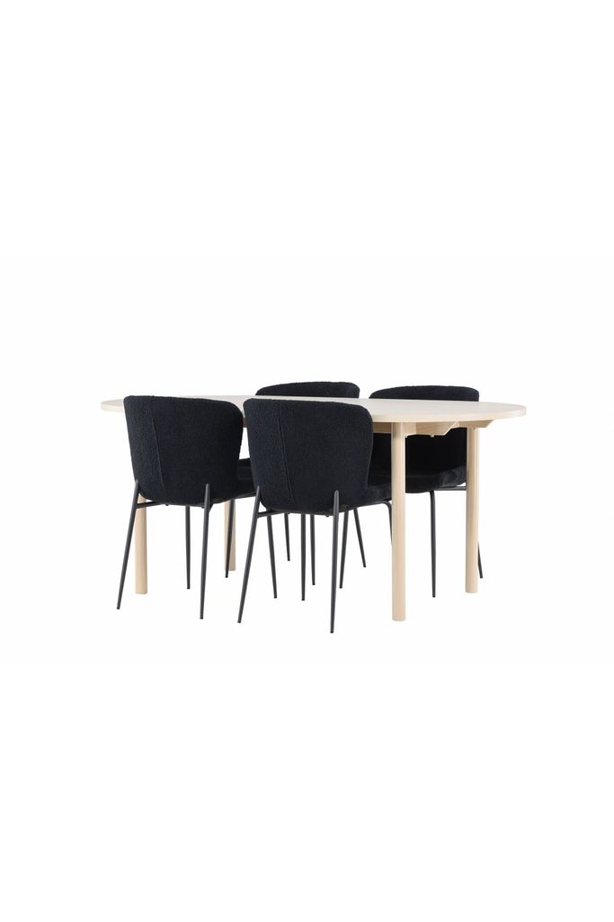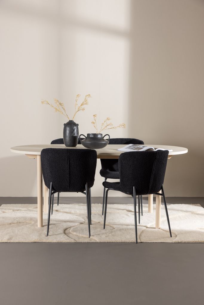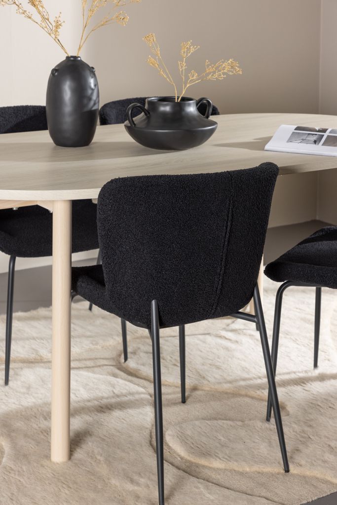 Komplettera bordet med Modesto matstolar för en touch av modern elegans. Stolsitsen är klädd i mjukt svart teddymaterial, vilket ger både komfort och stil. De svarta stålbenen förstärker den tidlösa designen och erbjuder en stabil och trygg sittupplevelse.