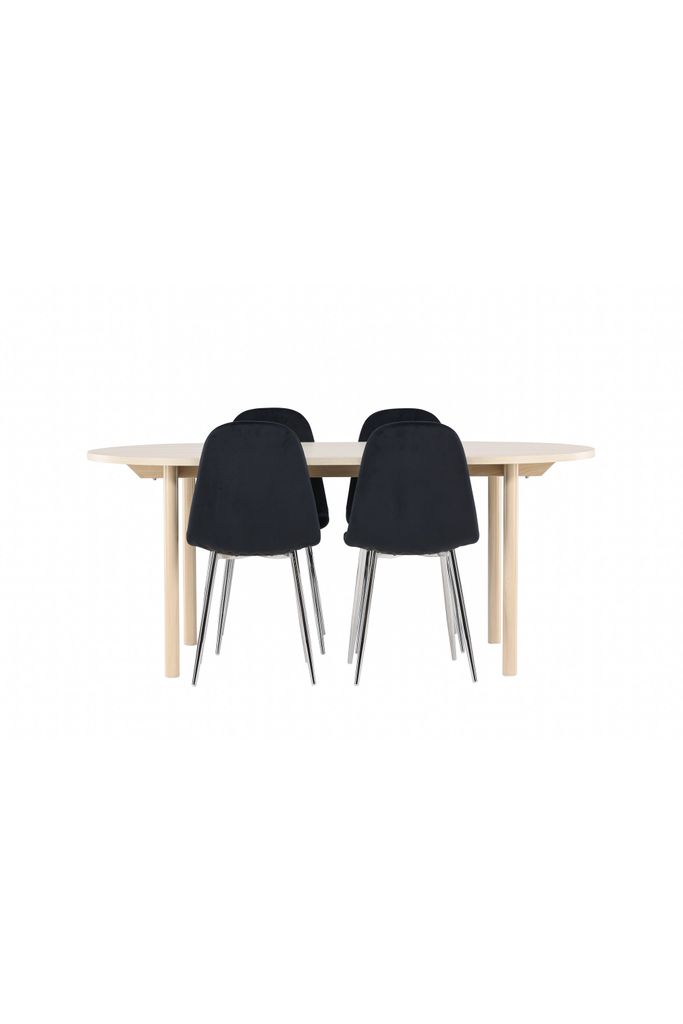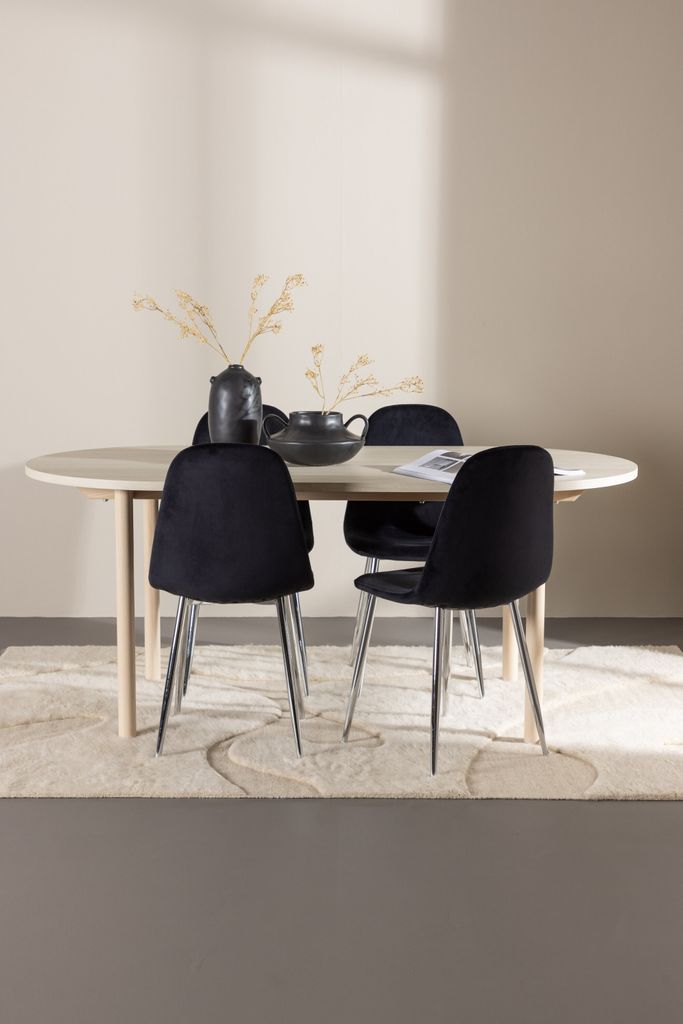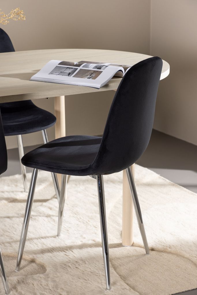 Skapa en elegant och inbjudande atmosfär i ditt hem med denna matgrupp från Venture Home. Polar Matstol erbjuder en lyxig känsla med sin helklädda design i mjukt svart sammetstyg. Benen i kromad metall ger stolarna en modern touch, medan den lätt rundade ryggen och sitsens stoppning bidrar till en hög komfortnivå.
