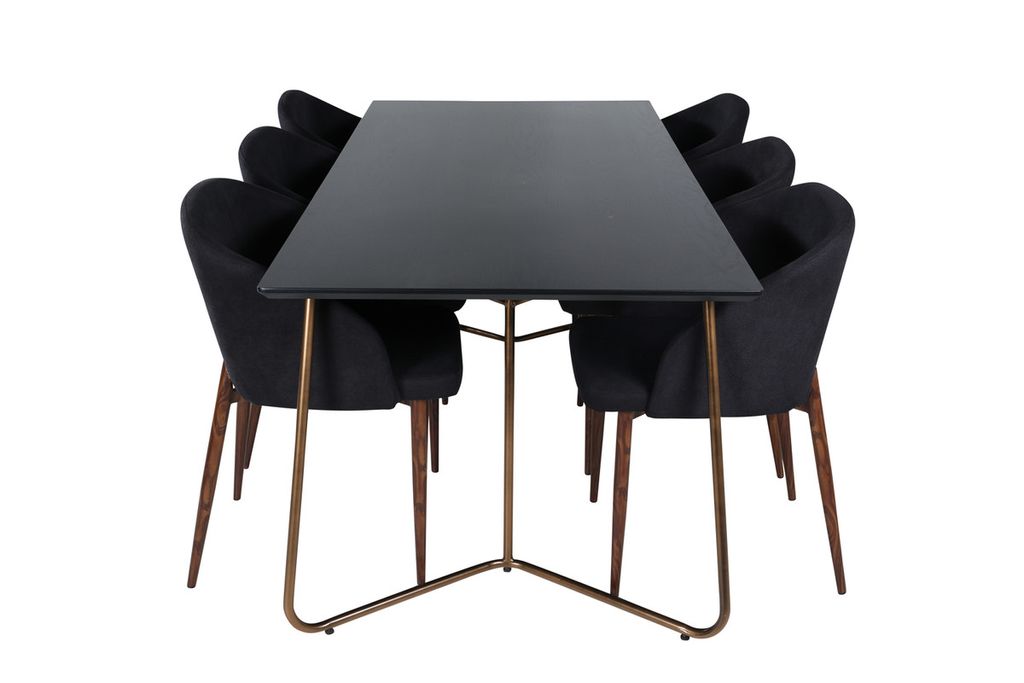 Låt den här vackert matchade matgruppen med modern känsla bli en naturlig samlingsplats i ditt hem. Matbord Petra har en genomtänkt design med skandinaviska former som ger en stilren känsla, smala, lätt utsvängda ben i järn och en bordsskiva i svart MDF med faner. Bordets mått: Längd: 190cm, Bredd: 90cm, Höjd: 75cm. Matchas här med 6st av våra läckra matstolar Arch med valnötsfärgade stolsben i metall och svarta sitsar i polyester. Stolens mått: Höjd: 83cm, Sitthöjd: 53cm, Bredd: 48,5cm, Djup: 55cm. En matgrupp med alla rätt helt enkelt!