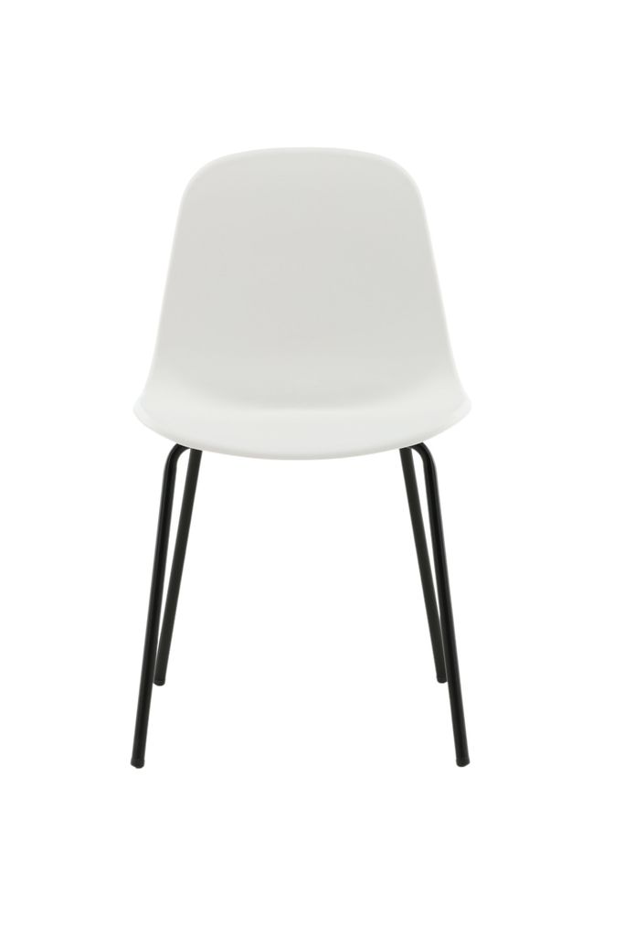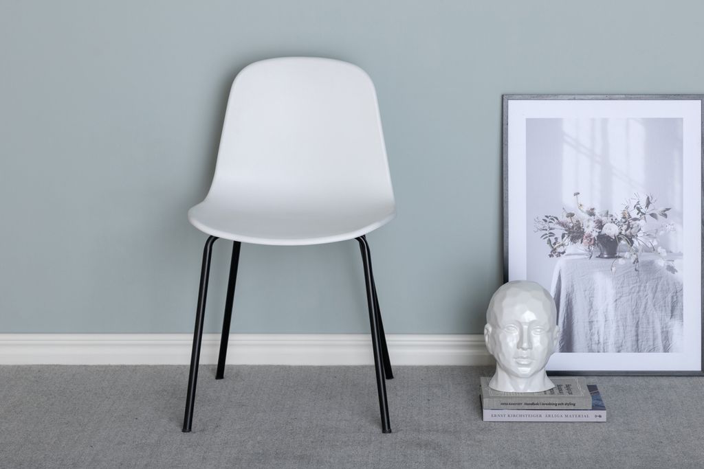 Praktiska och slitstarka matstolar i vit plast med svarta metallben, perfekt för moderna hem.