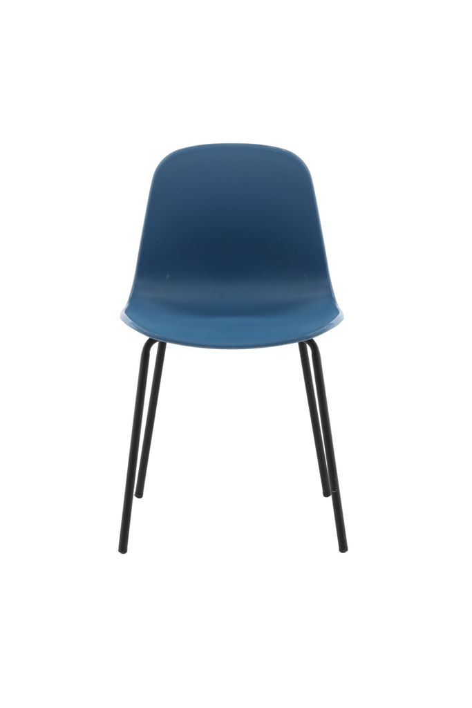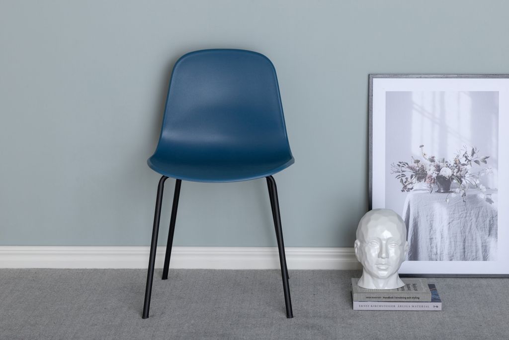 Stilren och slitstark matstol i blå plast med svarta metallben. Perfekt för moderna hem.