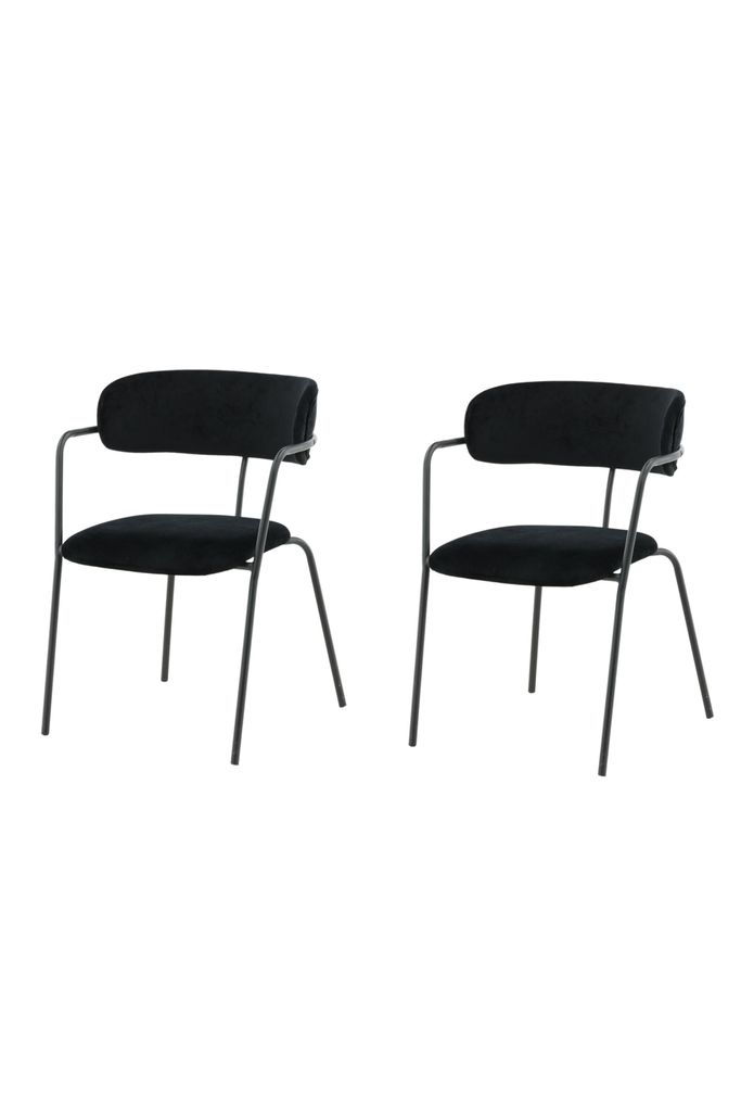 Stilren matstol i svart sammet och metall med integrerade armstöd. Perfekt för alla moderna hem.