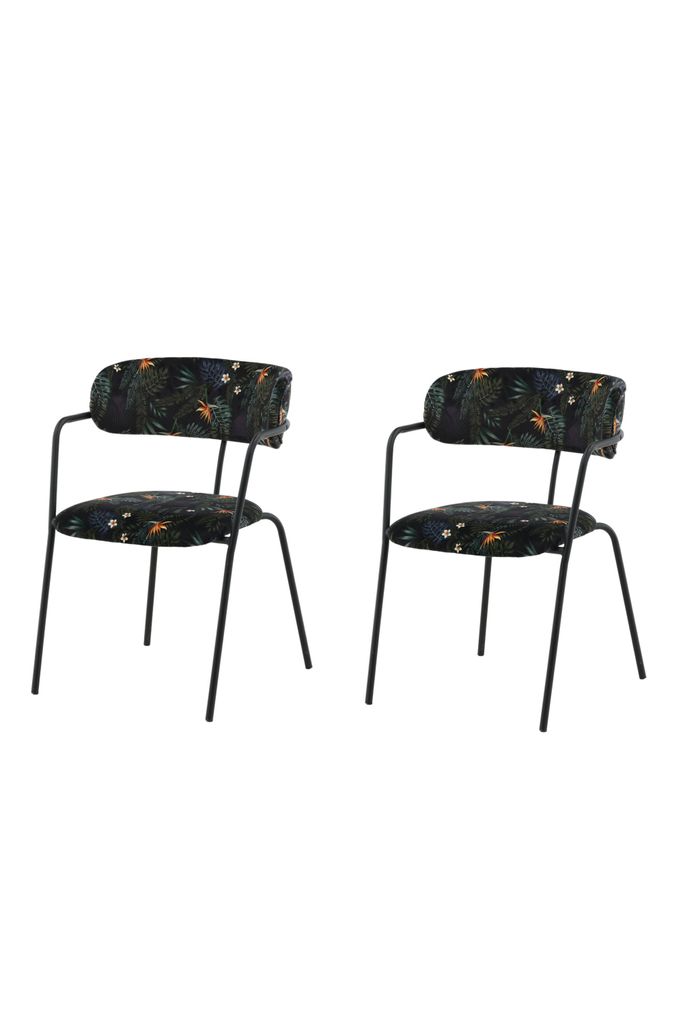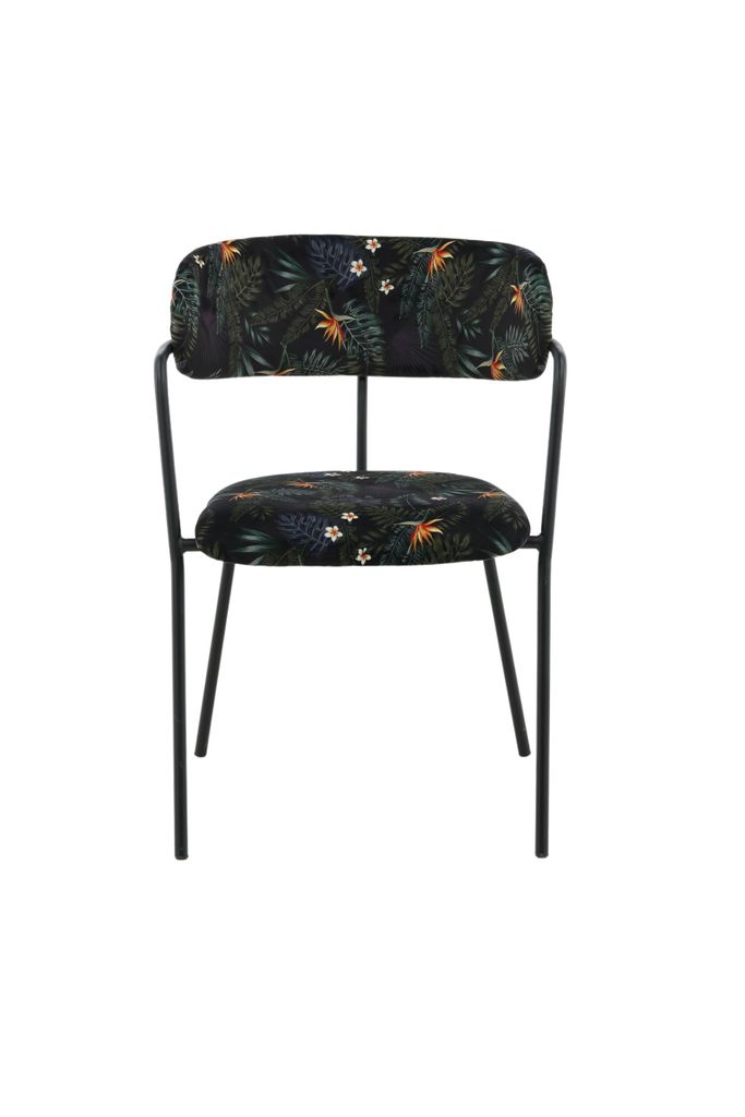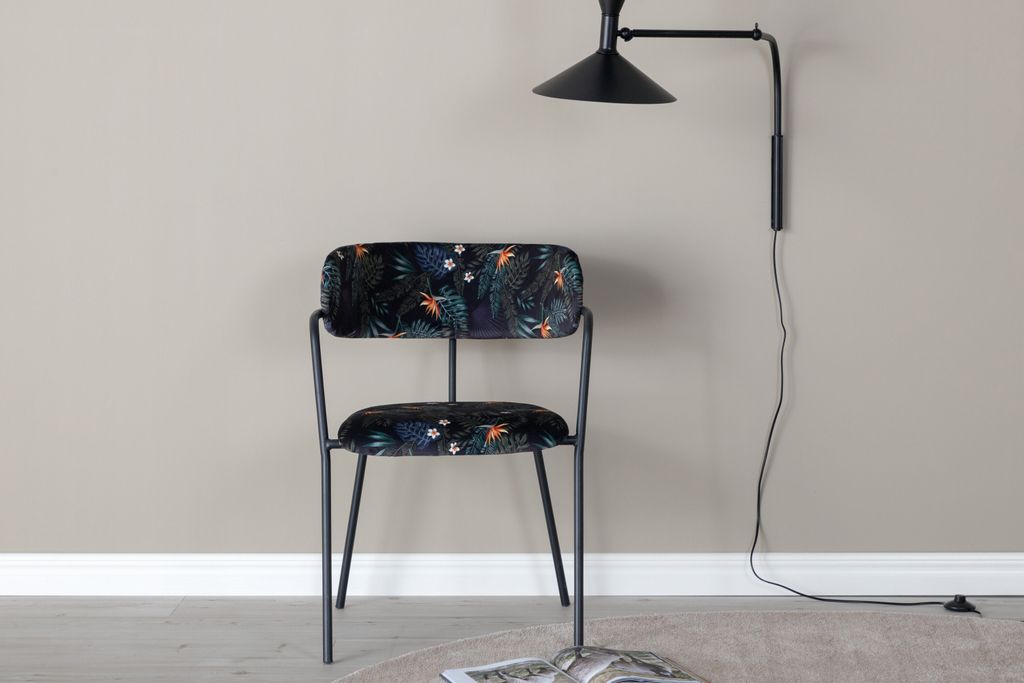 Elegant matstol med svart metallstomme och blommönstrad sits. Perfekt för att skapa ett stilrent blickfång i ditt hem.
