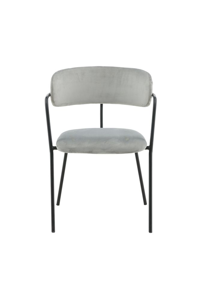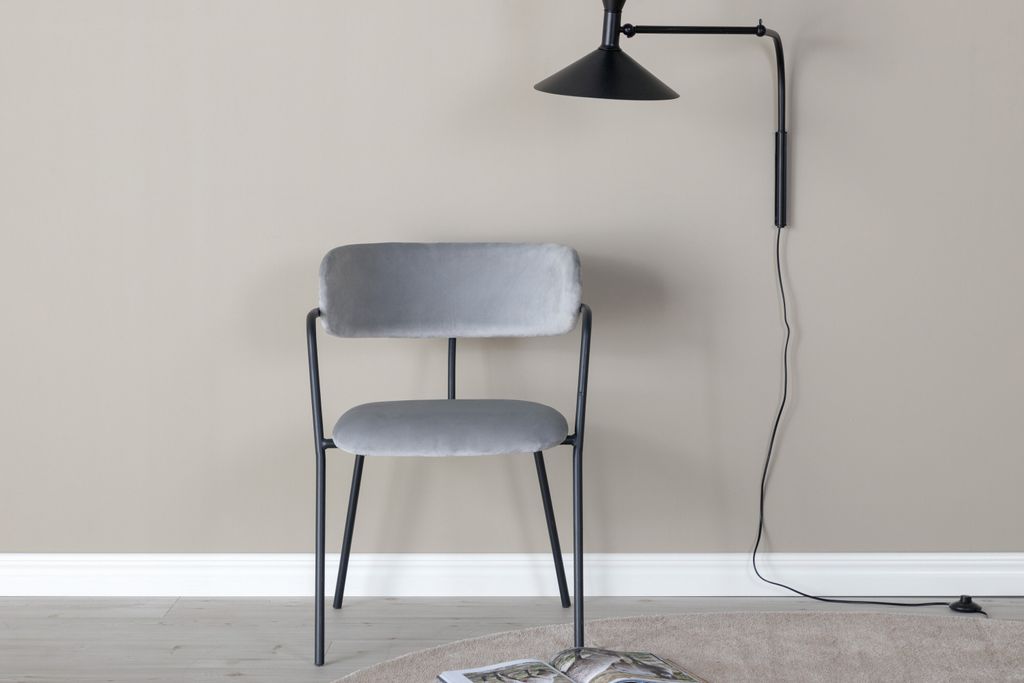 Den stilrena designen inkluderar en svart pulverlackerad metallstomme med integrerade armstöd, vilket ger en stabil och elegant look. Den lätt rundade ryggen och sitsen är klädda i grått sammetstyg, vilket skapar ett mjukt och inbjudande intryck.