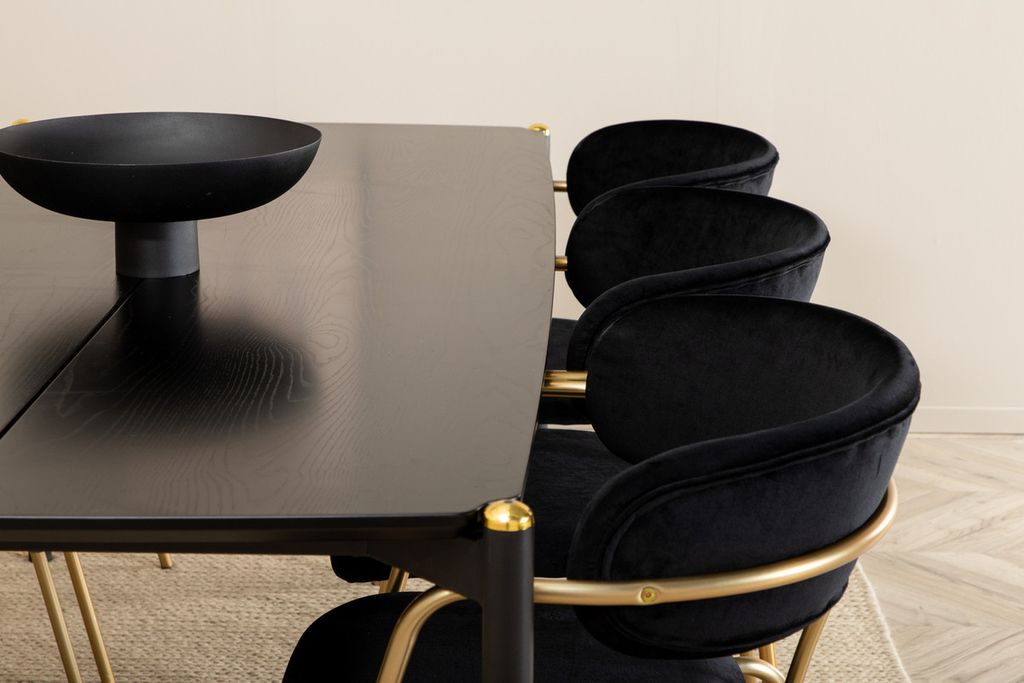 Stilsäkert, lyxigt och tidlöst – Matbord Pelle skapar ett modemedvetet intryck i ditt hem! Designen är genomtänkt med raka nordiska former som ger en stilren känsla, smala ben i järn som har en dekorativ mässingknopp på toppen och en springa i bordsskivans mitt som blir en läcker detalj. Bordsskivan är i svart MDF med faner och bordets mått: Längd: 190cm, Bredd: 90cm, Höjd: 75cm. Matchas här med 6st Arrow matstolar med mässingfärgade stolsben i metall och svarta sitsar i mjukt sammetstyg. Stolens mått: Höjd: 79cm, Sitthöjd: 47cm, Bredd: 58cm, Djup: 61cm.