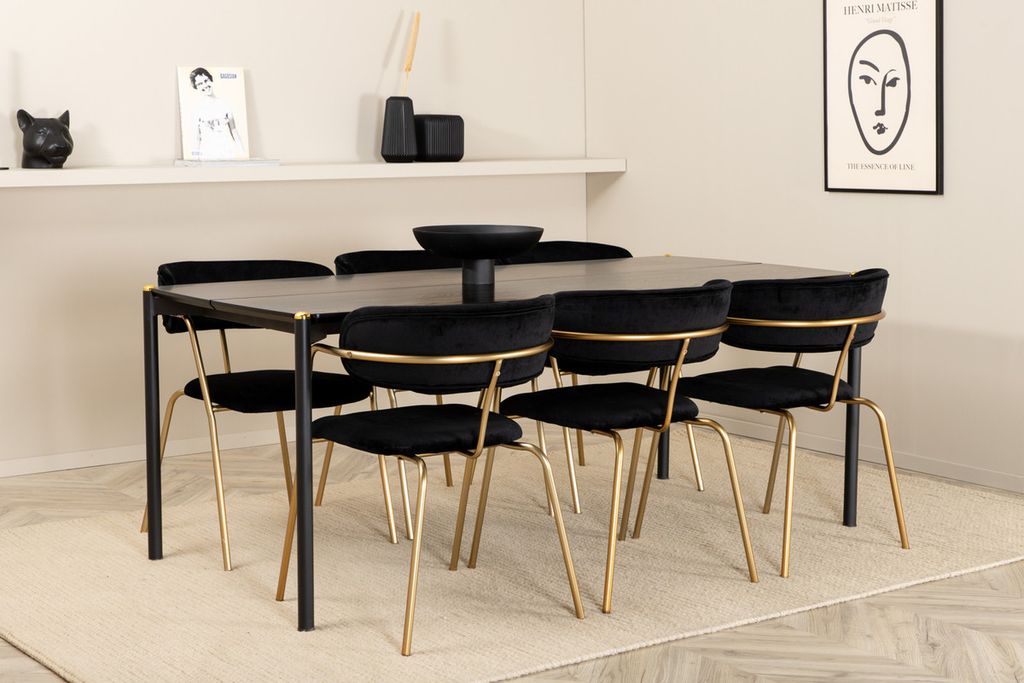 Venture Home Arrow & Pelle 6 st Matstolar Svart + Rektangulärt Matbord 190 x 90 Svart