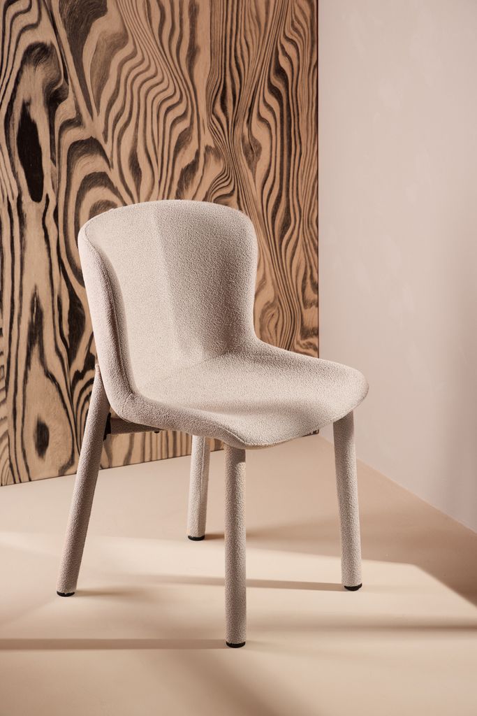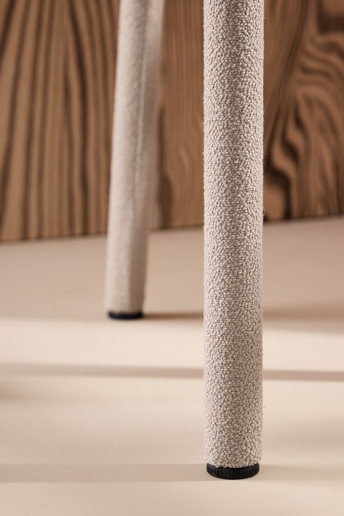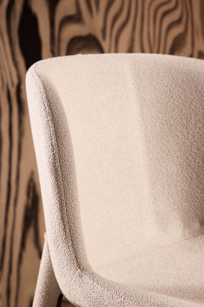 Den eleganta beige bouclén ger stolarna en sofistikerad och exklusiv känsla. Bouclétygets subtila struktur och mjuka nyans gör att Astoria smälter in i olika inredningsstilar, från moderna till klassiska.