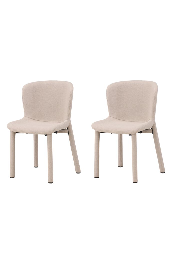 Stolarnas stabilitet kommer från den robusta stålramen, som smidigt täcks av bouclétyget för ett enhetligt utseende. Mått: 54 x 83 x 52 cm, med en sitthöjd på 47 cm, vilket gör dem väl anpassade för de flesta matbord.