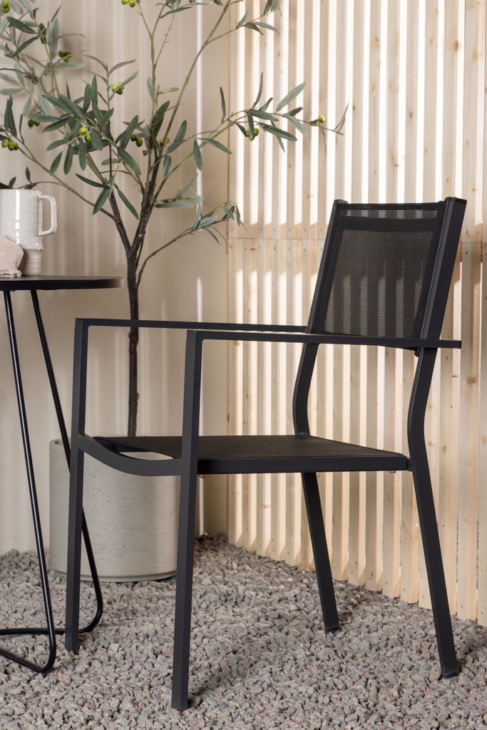 De medföljande stapelbara stolarna från Copacabana-serien är designade med raka, nordiska former och en sits i svart textilene. Stolsbenen i svart aluminium kompletterar bordets design och ger en enhetlig look.