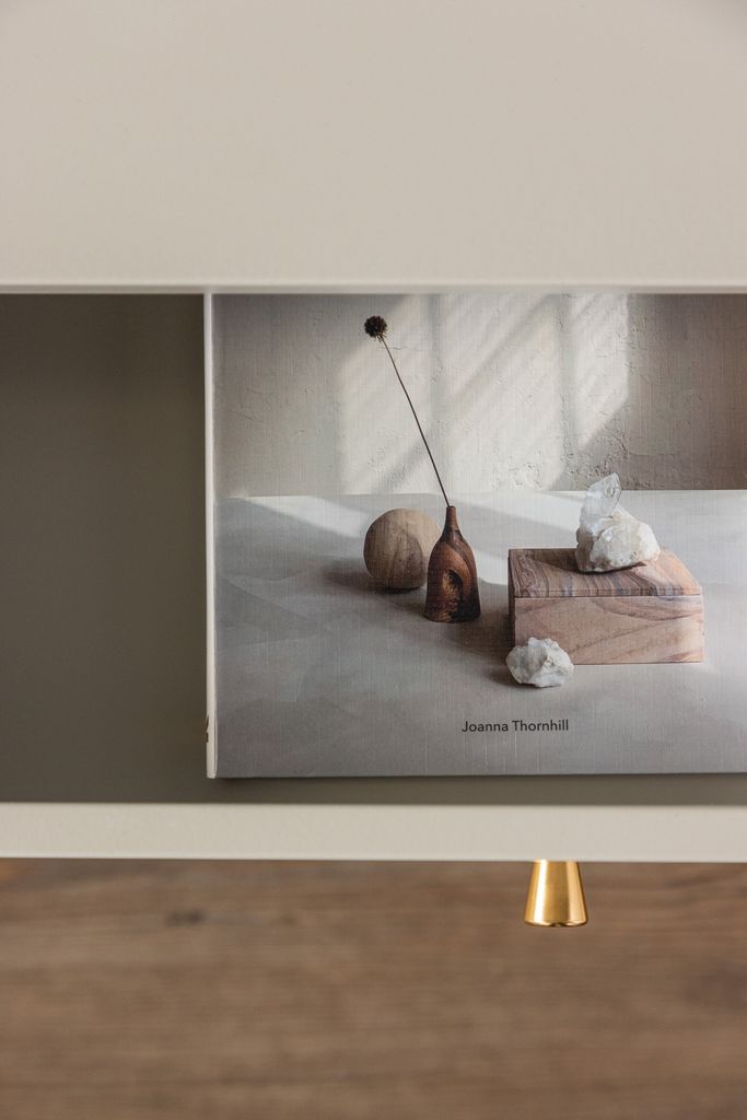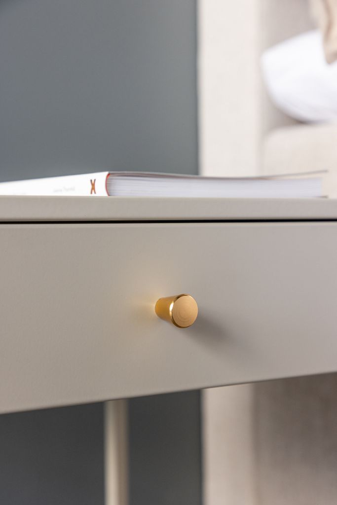 Stilrent beige sängbord i skandinavisk design med mässingsknopp och dold förvaring. Perfekt för alla rum.