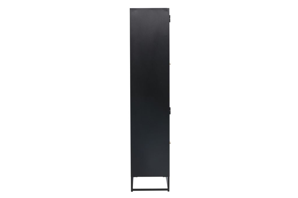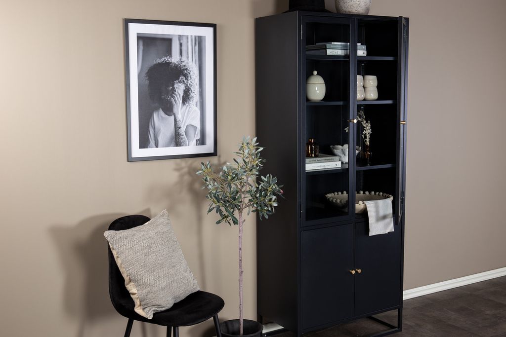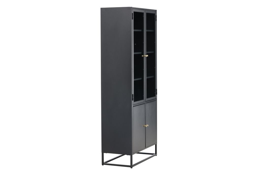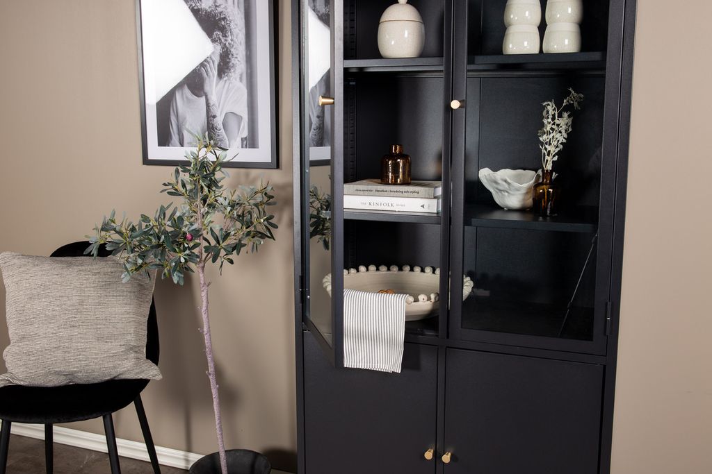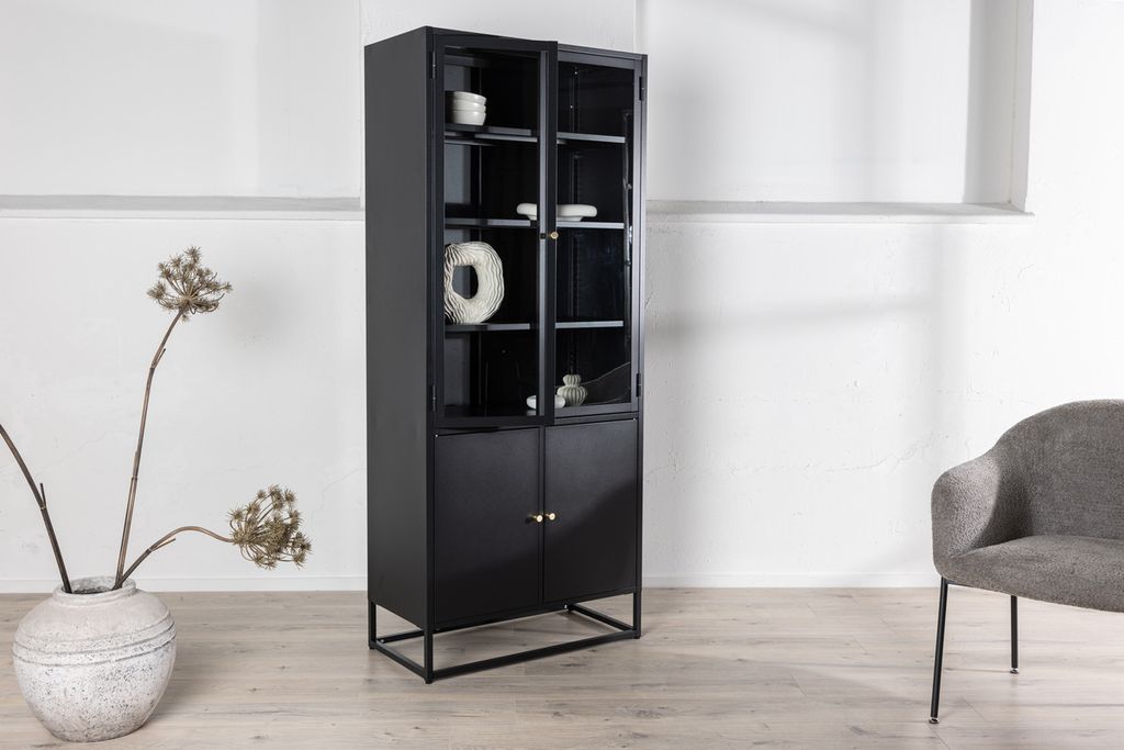 Piring är ett högt skåp i svart stål med en balanserad mix av öppen och dold förvaring. De övre glasdörrarna ger ett lätt och luftigt intryck, medan de nedre dörrarna håller det du inte vill visa dolt.