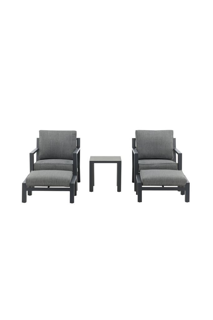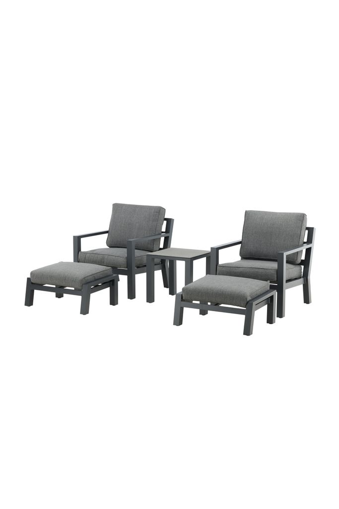 Stilren och bekväm loungegrupp i svart aluminium med grå dynor och glasbord. Perfekt för avkoppling utomhus.