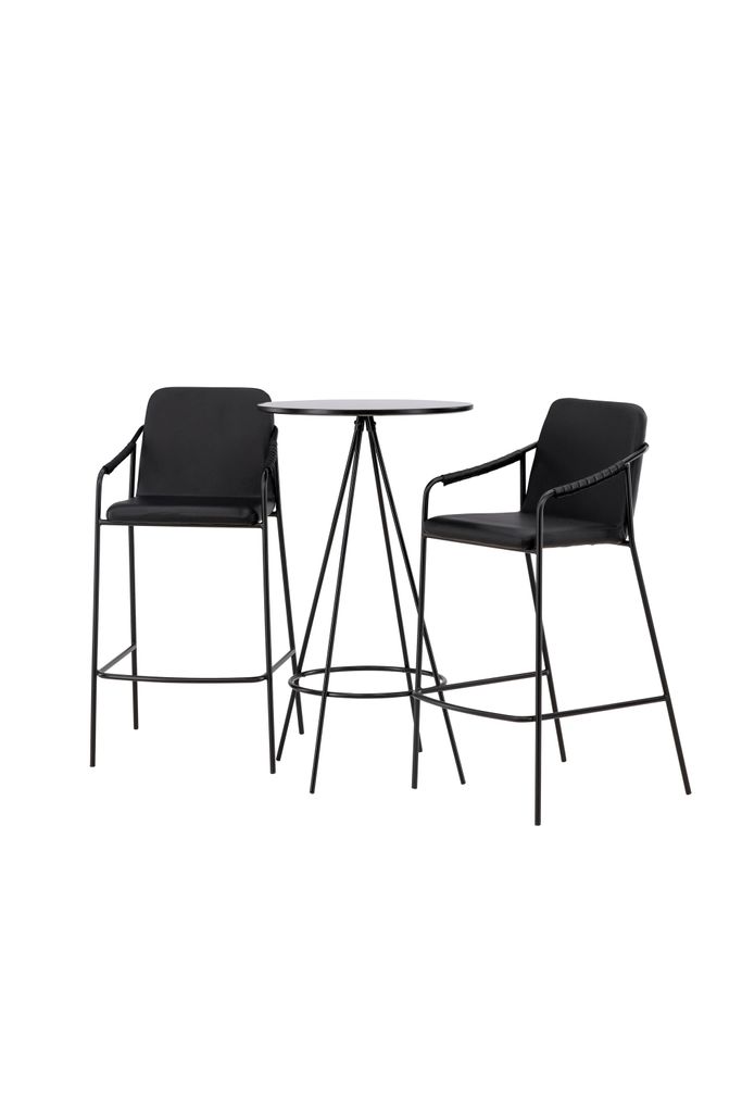 Barbordet är utformat med en rund bordsskiva i svart MDF med faner, vilket ger en snygg och hållbar yta. De konformade benen i svart metall har en lätt utsvängd design och ett integrerat fotstöd som tillför både stabilitet och komfort.