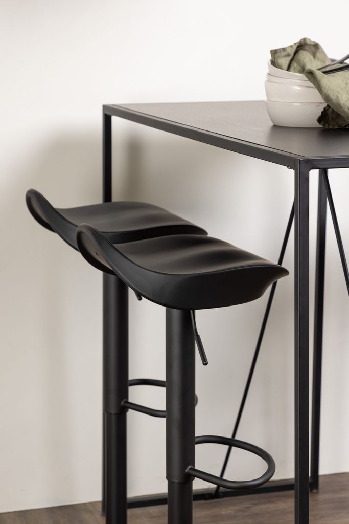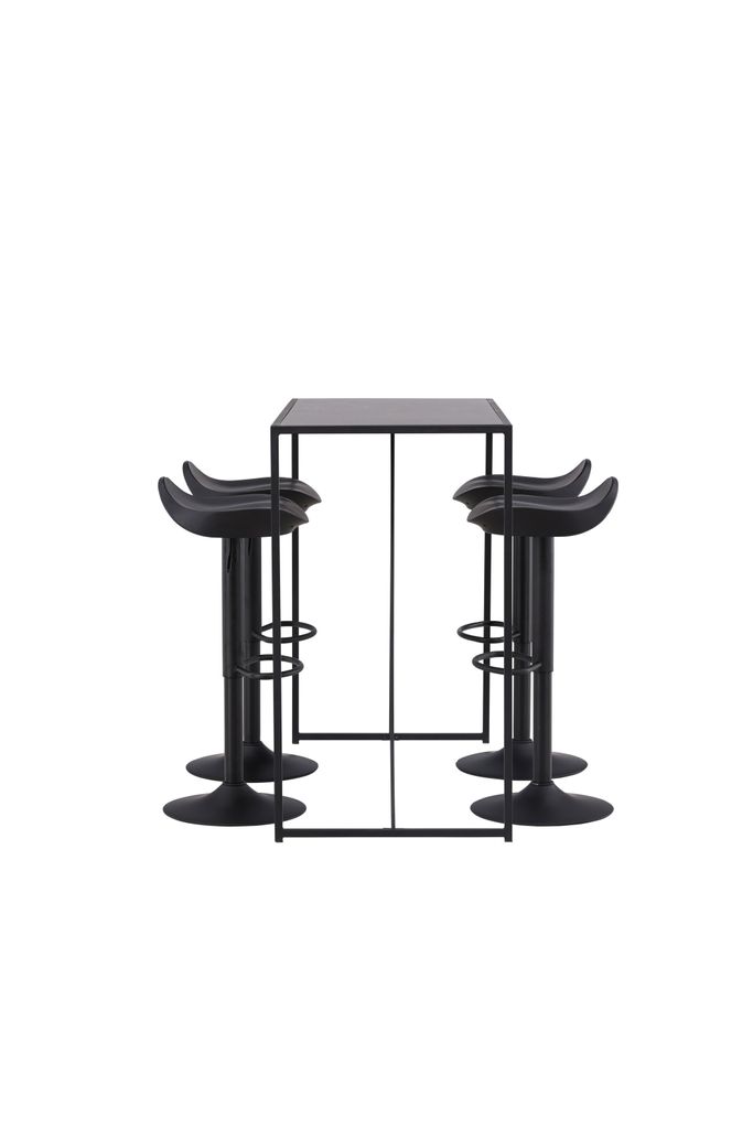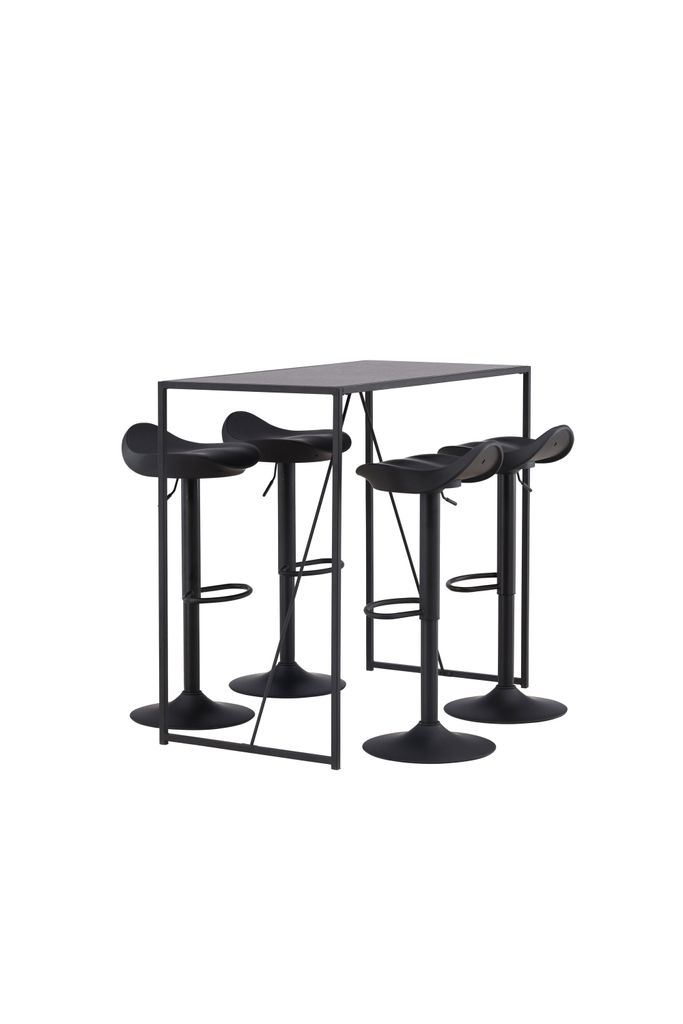 Upptäck Venture Home Barset Brea med fyra stilsäkra barstolar Adesto. Denna moderna bargrupp kombinerar ett minimalistiskt bord i svart MDF med en robust ram av svart stål. De fyra barstolarna har en elegant trumpetfot i svart stål och en ergonomisk sits i svart plast som ger både stil och komfort.
