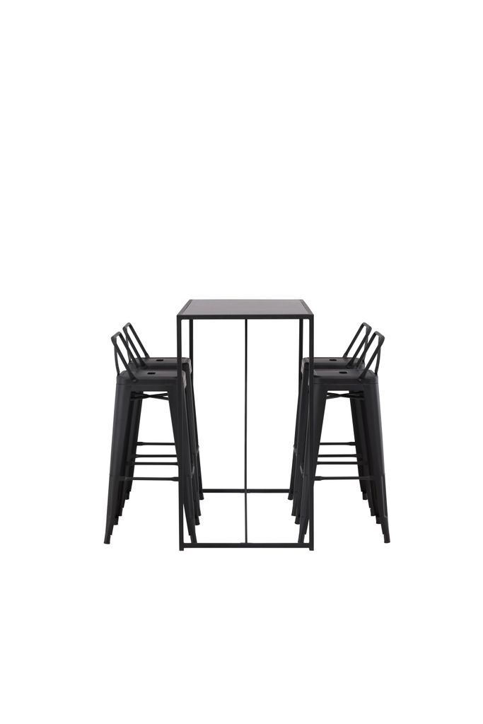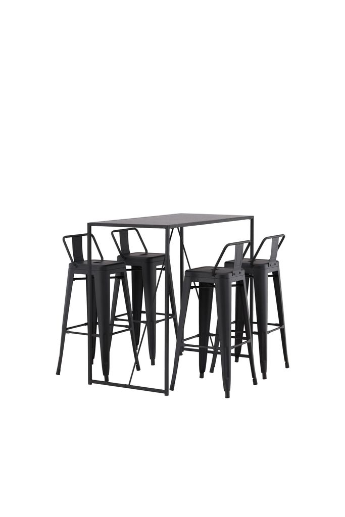 Elegant och industriell bargrupp med stilrena barstolar och ett minimalistiskt bord, perfekt för moderna hem.