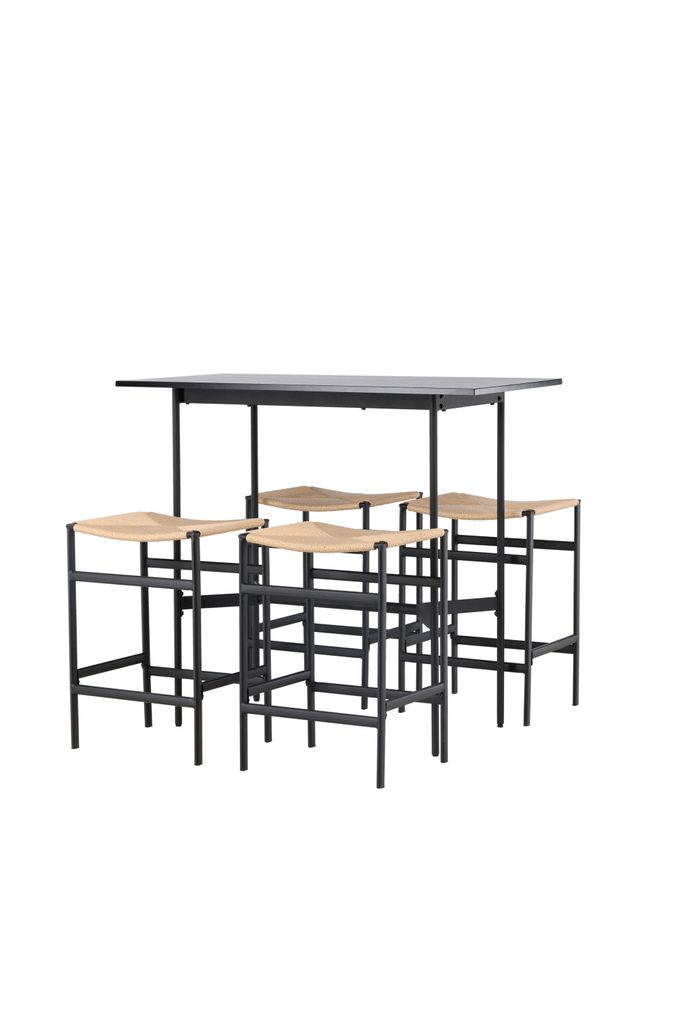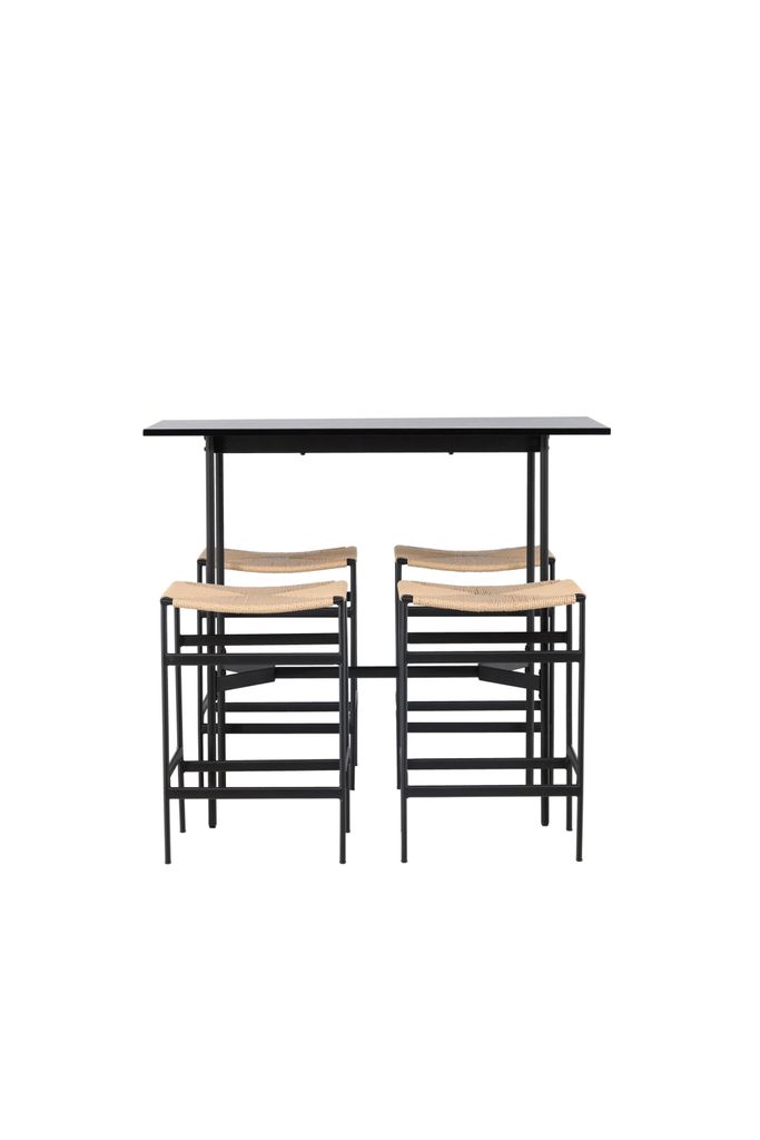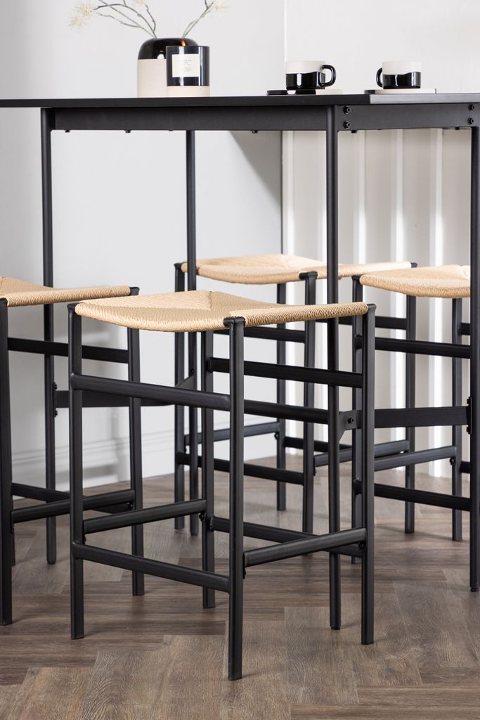 Elegant barset med industriell design. Svart bord och stolar i naturfärgat rep ger en stilren kombination.