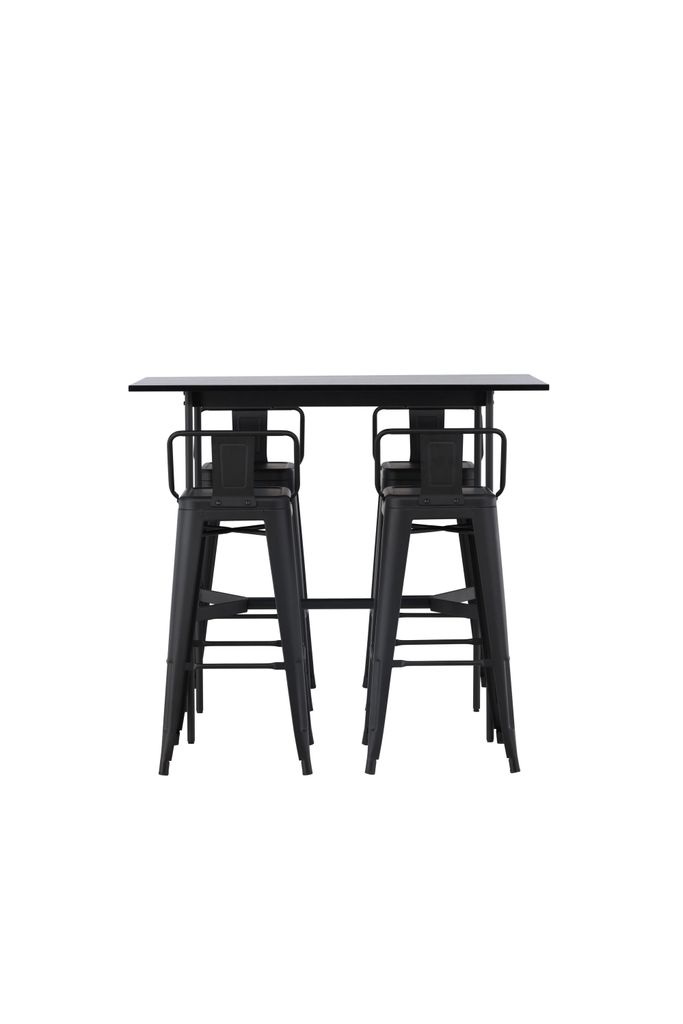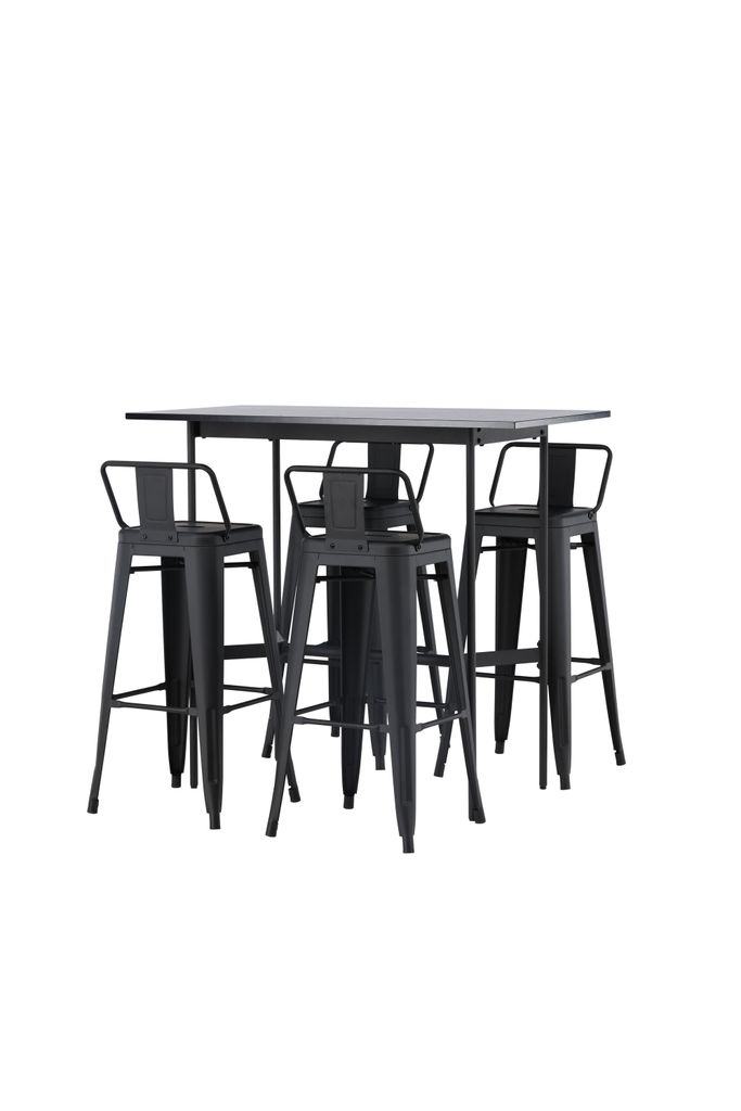 Modern och stilren bargrupp med svart MDF-bord och stålstolar. Perfekt för eleganta miljöer.