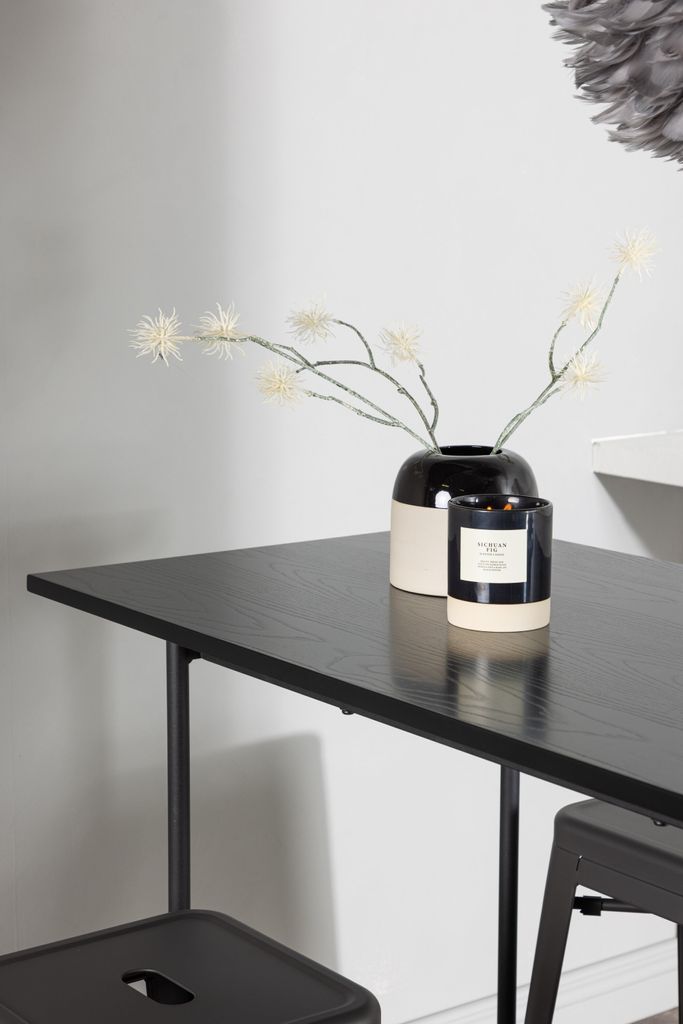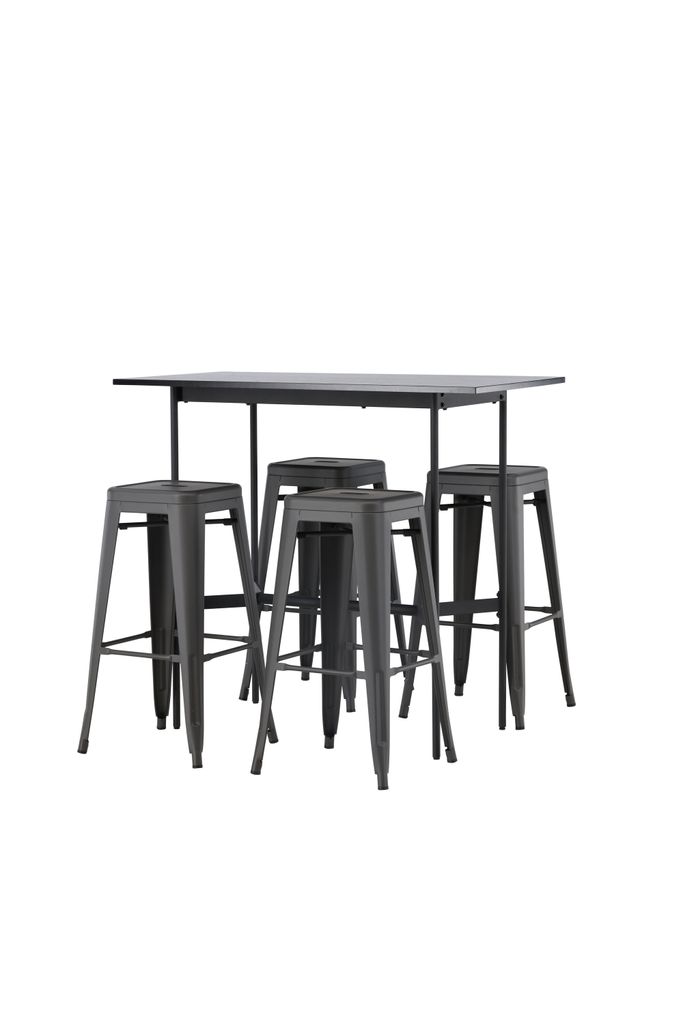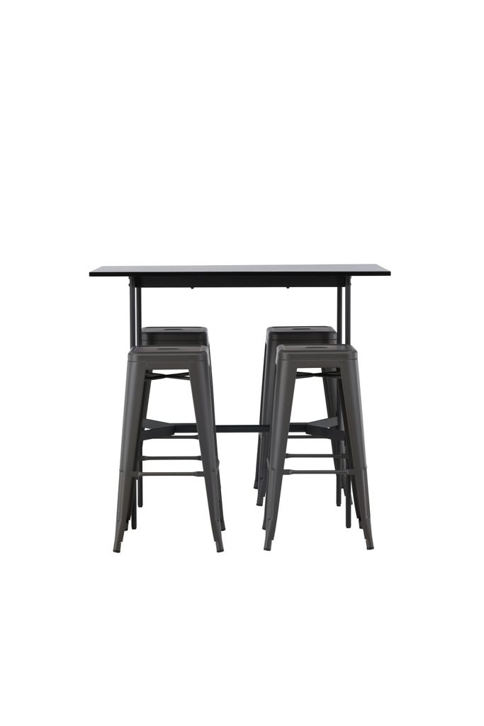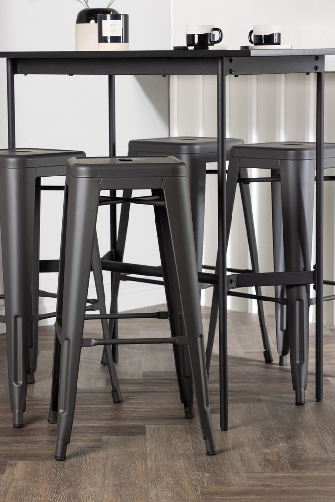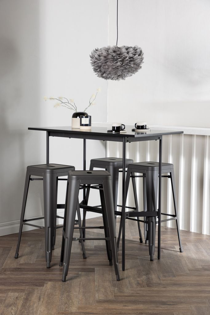 Upplev elegans och funktion med Venture Home Barset Rax, en stilren kombination som lyfter både kök och vardagsrum. Det minimalistiska barbordet har en tunn bordsskiva i svart MDF som vilar på smala bordsben i svart metall med integrerat fotstöd. Kombinationen med de grå barstolarna från serien Tempe ger en modern touch. Stolarna har en klassisk pallsdesign med lätt utsvängda ben och sits i mörkgrått stål, kompletterade med en praktisk fotstöd. Bordets dimensioner är 120x60 cm, vilket gör det perfekt för mindre utrymmen utan att kompromissa på stilen.