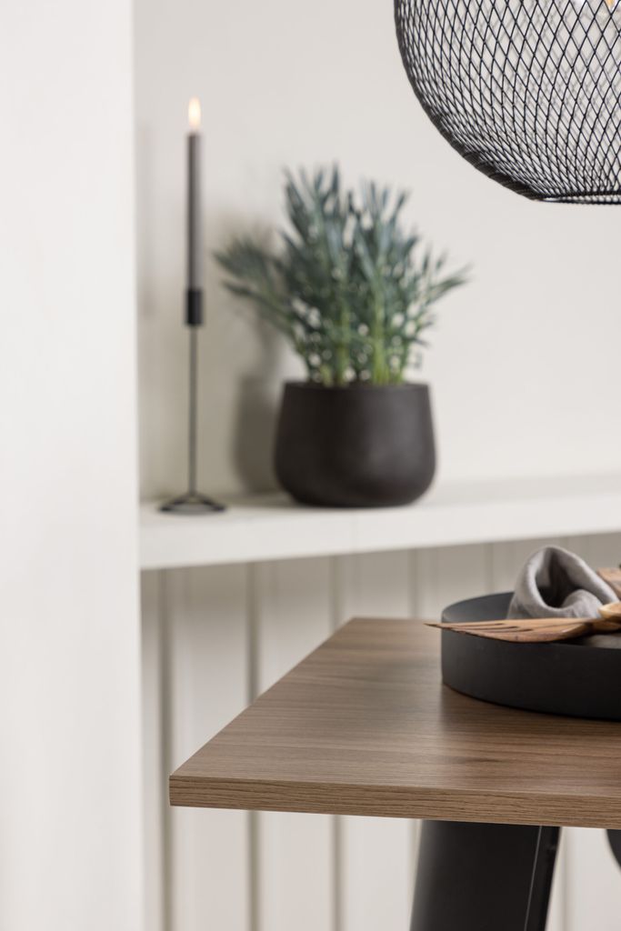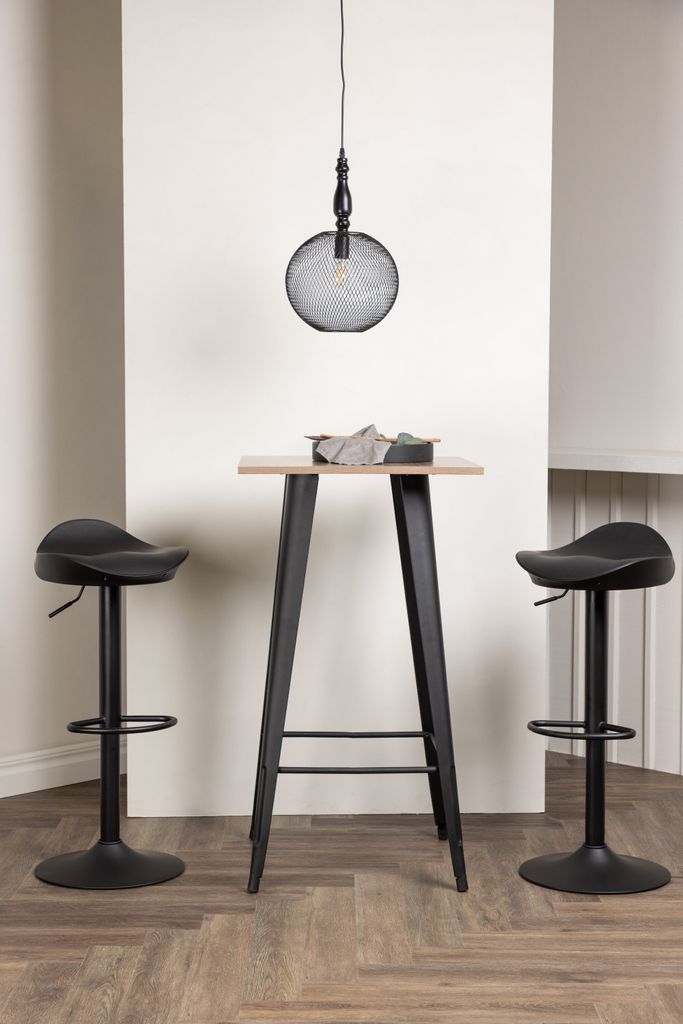 Barbordet Tempe har en kvadratisk bordsskiva i valnötsfärgad MDF, vilket ger en varm och inbjudande känsla. De svarta metallbenen är lätt utsvängda och ger stabilitet till bordet.