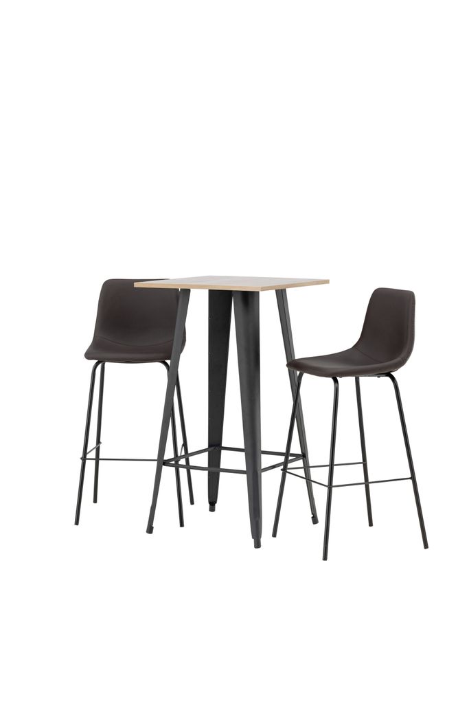 Upptäck det stilrena Venture Home Barset Tempe, en perfekt kombination av modern minimalism och hållbara material. Barbordet har en elegant kvadratisk bordsskiva i valnötsfärgad MDF, som vilar på lätt utsvängda, svarta metallben. Bordet är utrustat med en ram för fotstöd, vilket ger extra komfort när du sitter. Detta barset kombineras med de snygga, bruna barstolarna från serien Alexi. Stolarna är helklädda i mjukt, brunt polyuretanskinn och polyester, vilket skapar en behaglig sittupplevelse. Den smala benställningen i svart pulverlackerad metall har ett integrerat fotstöd för ytterligare komfort.