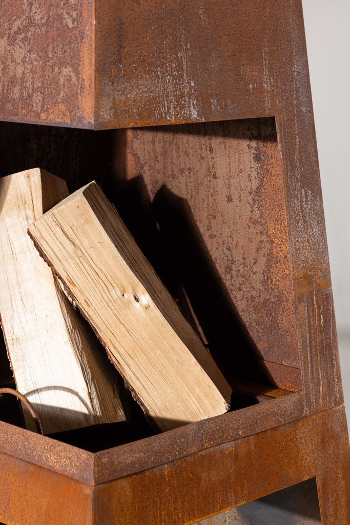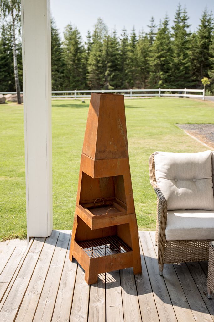 Förhöj atmosfären på uteplatsen med denna stilrena eldkorg i rostigt stål, perfekt för sena sommarkvällar.
