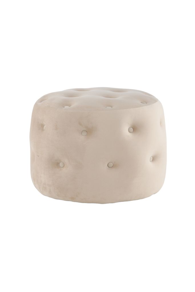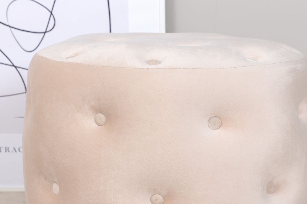Elegant sittpuff i beige sammet med djuphäftade knappar, perfekt som extra sittplats eller stilfull inredningsdetalj.