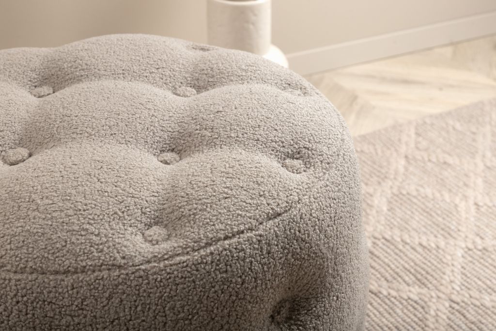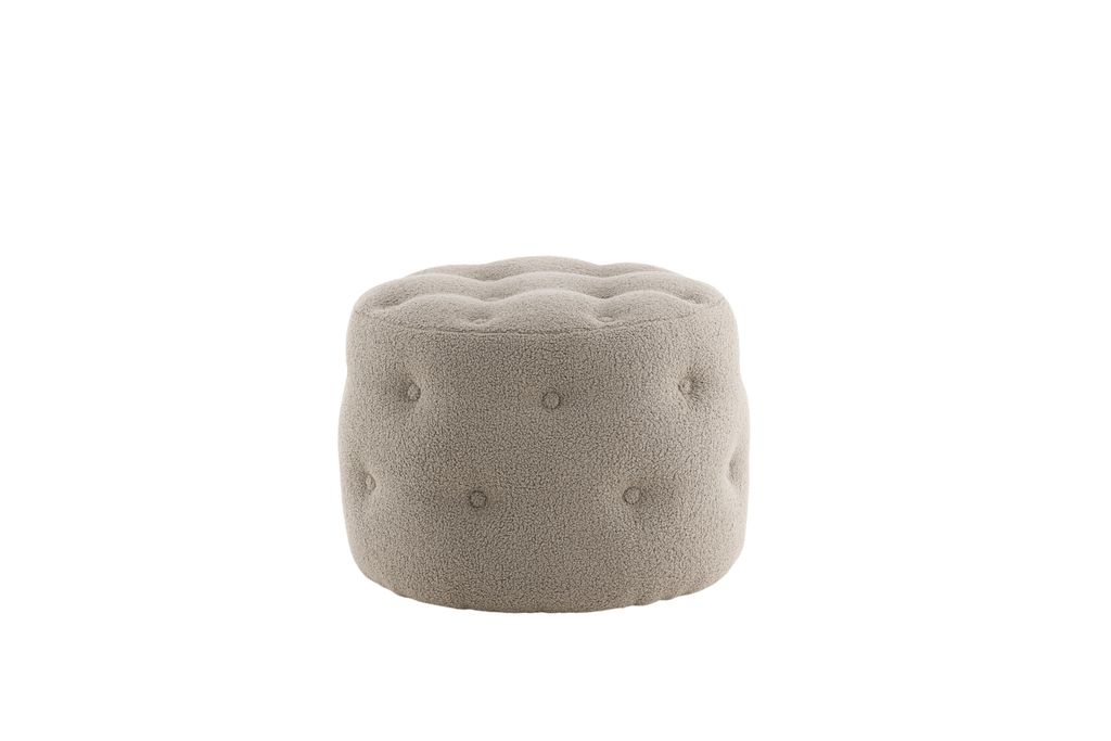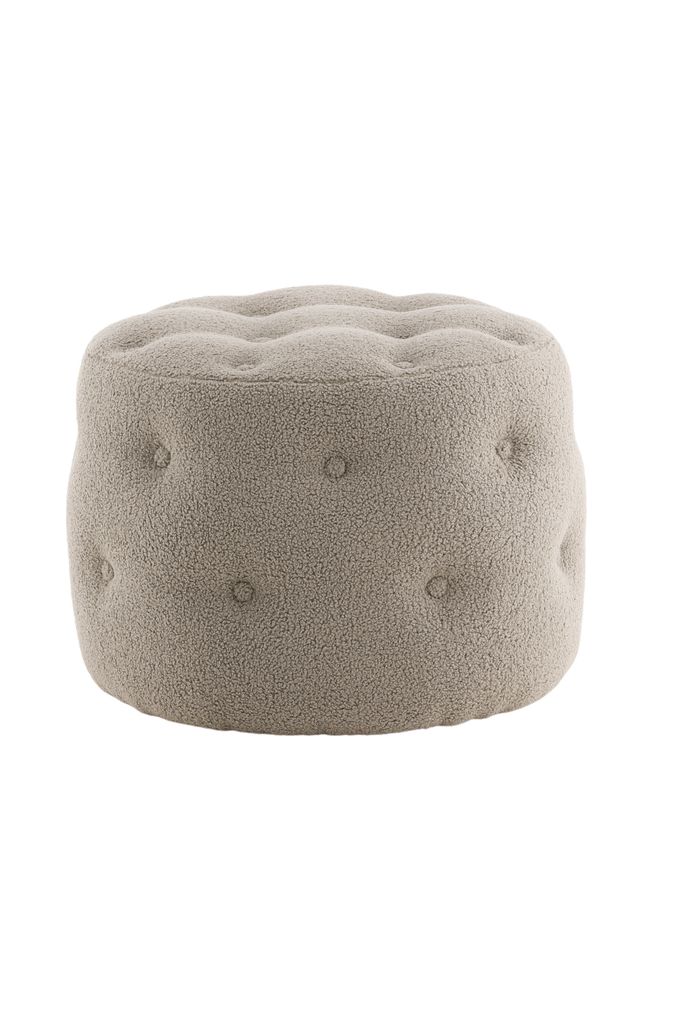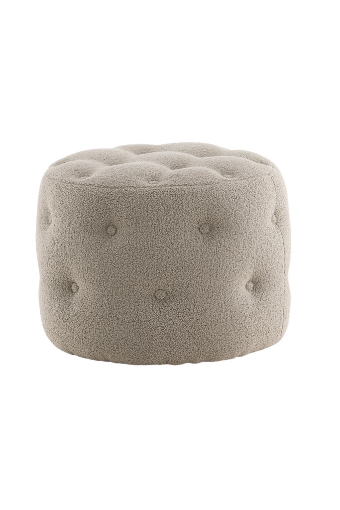 Stilren och multifunktionell sittpuff i greige teddytyg med elegant djuphäftad design. Perfekt som extra sittplats eller fotpall.