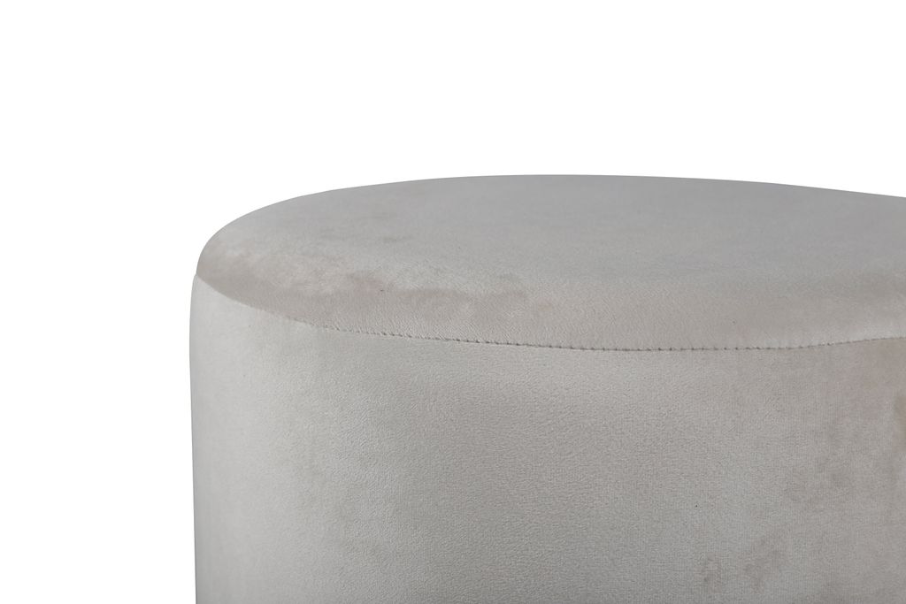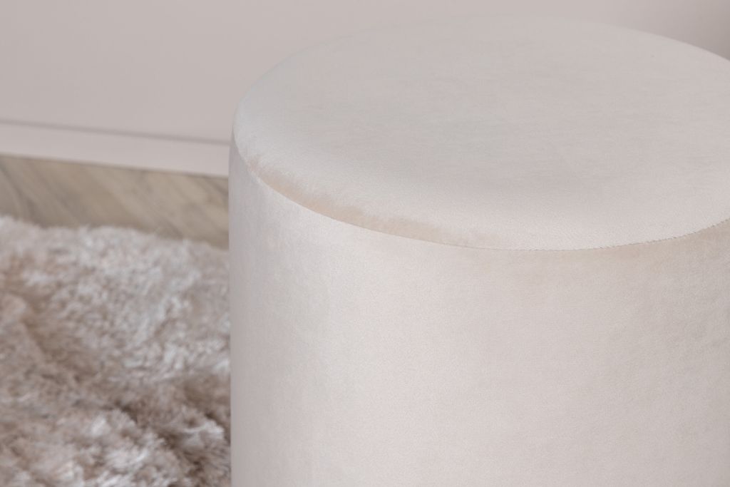 Elegant sittpuff i beige sammet med svart metallbas. Perfekt som extra sittplats eller fotpall.