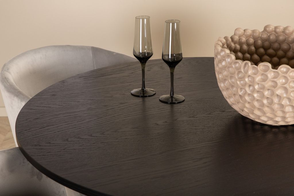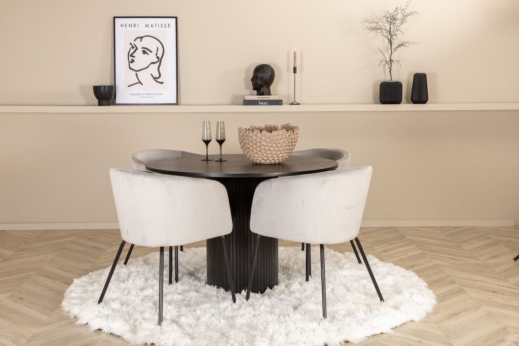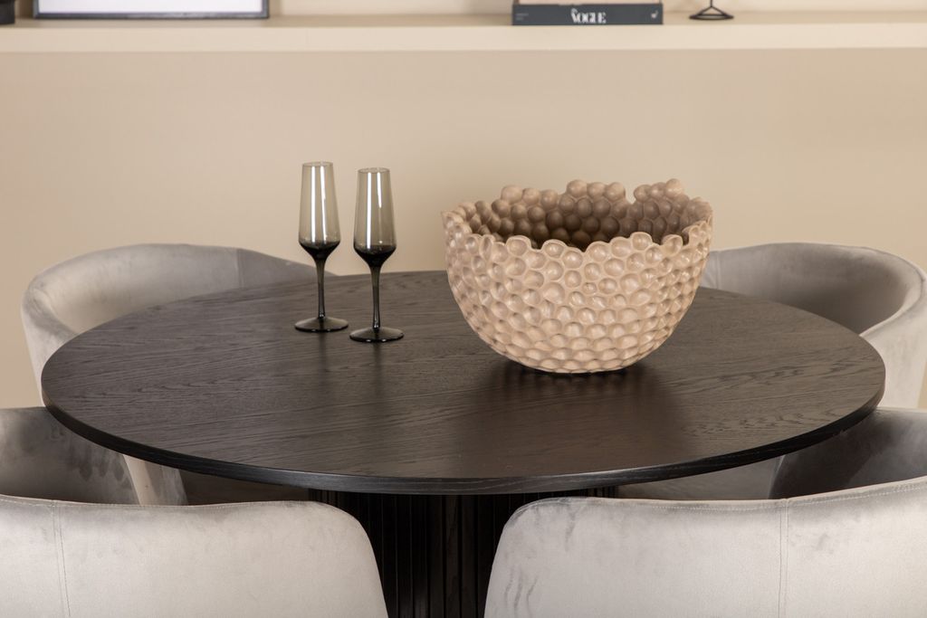 Modernt, stilsäkert och pampigt - skapa ett lyxigt blickfång i hemmets hjärta! Vårt runda matbord Bianca i genomgående svart kulör har en trendig utformning med en bordskiva i MDF och en robust stomme i ribbad design som ger ett stadigt intryck. Här i perfekt kombination med 4st Berit matstolar i lyxig design. Stolen har en pampig design i smäcker grå sammet och stolsbenen är stilrent smala i svart järn. Möblera inbjudande och skapa en stilren look i ditt hem!