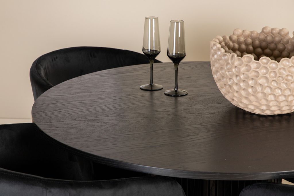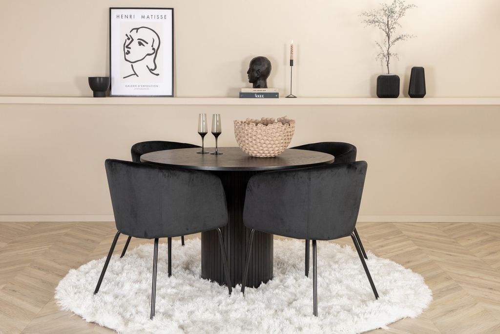 Modernt, stilsäkert och pampigt - skapa ett lyxigt blickfång i hemmets hjärta! Vårt runda matbord Bianca i genomgående svart kulör har en trendig utformning med en bordskiva i MDF och en robust stomme i ribbad design som ger ett stadigt intryck. Här i perfekt kombination med 4st Berit matstolar i lyxig design. Stolen har en pampig design i kaxig svart sammet och stolsbenen är stilrent smala i svart järn. Möblera inbjudande och skapa en stilren look i ditt hem!