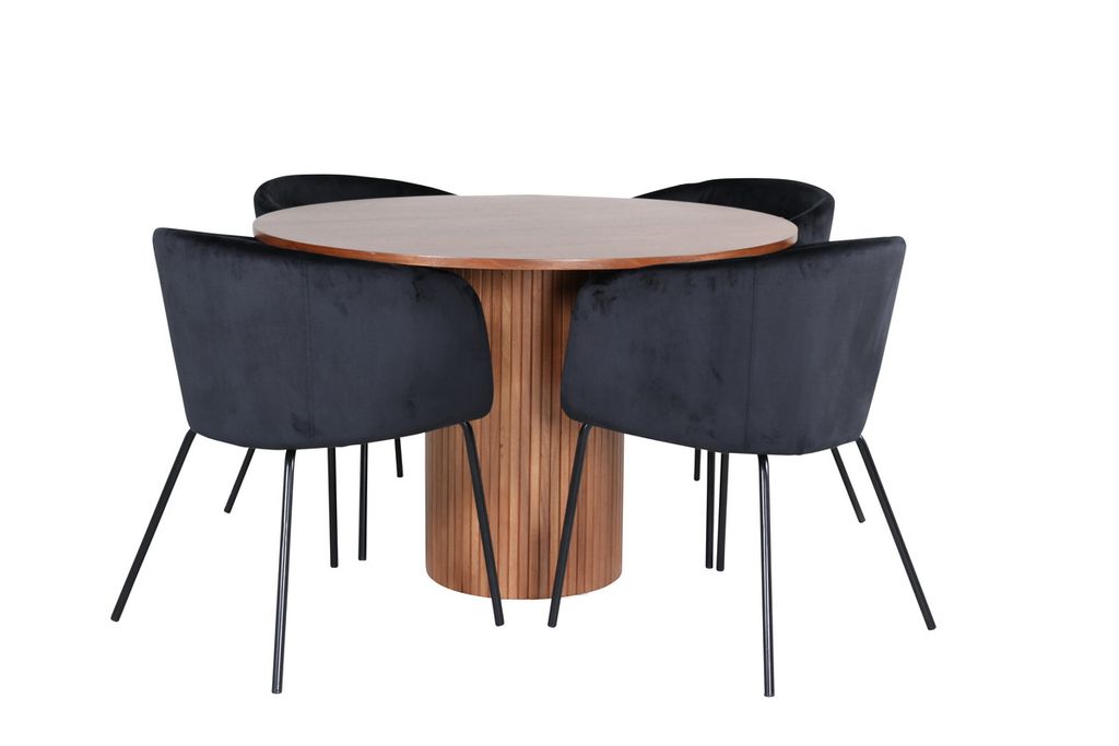 Pampigt och elegant - sätt en modern prägel på inredningen! Vårt runda matbord Bianca i trendig valnötskulör passar perfekt i både vardagsrummet eller det rymliga köket. Bordskivan är valnötsfärgad MDF med faner och stommen robust i valnöt samt svart kulör av trä och MDF i en ribbad design som ger ett stadigt intryck. Här tillsammans med 4st Berit matstolar i lyxig utformning. Sitsen är mjuk i svart sammet och stolsbenen stilrent smala i svart järn. Skapa ett inbjudande blickfång i hemmets hjärta!