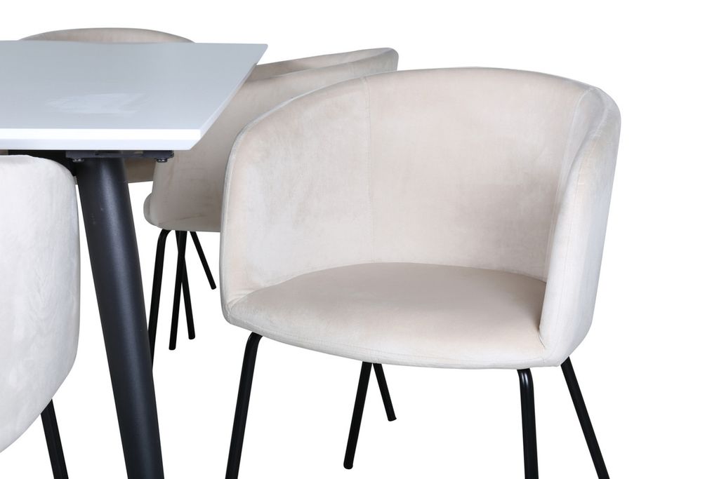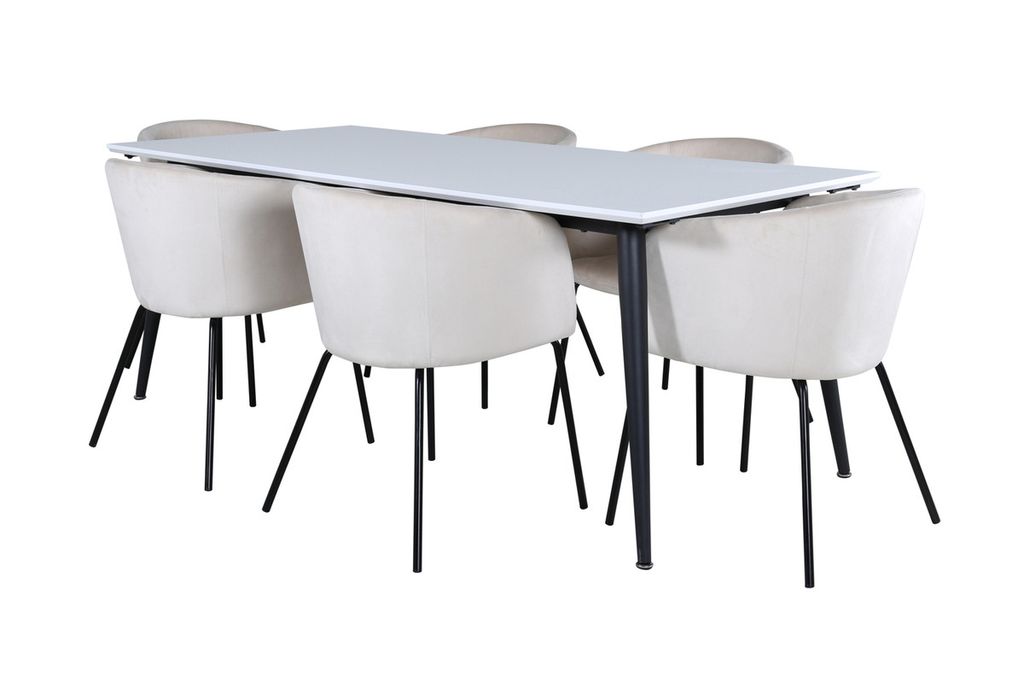 Våra populära matstolar Berit i lyxig design förlänger de trivsamma middagsstunderna! Stolen har ett generöst sittdjup med en sits i beige sammet och stilrent smala stolsben i svart järn. Stolens mått: Höjd: 78cm, Sitthöjd: 49cm, Bredd: 55cm, Djup: 55cm. Här matchas 6st matstolar med det klassiska matbordet Jimmy - ett säkert kort för alla tillfällen! Med en förlängningsbar toppskiva i vit HPL och MDF faner och lätt utsvängda ben i svart metall passar det här bordet perfekt till alla inredningsstilar och hem. Bordets mått: Längd förlängningsbart mellan: 195cm och 285cm, Bredd: 90cm, Höjd: 76cm.