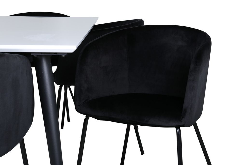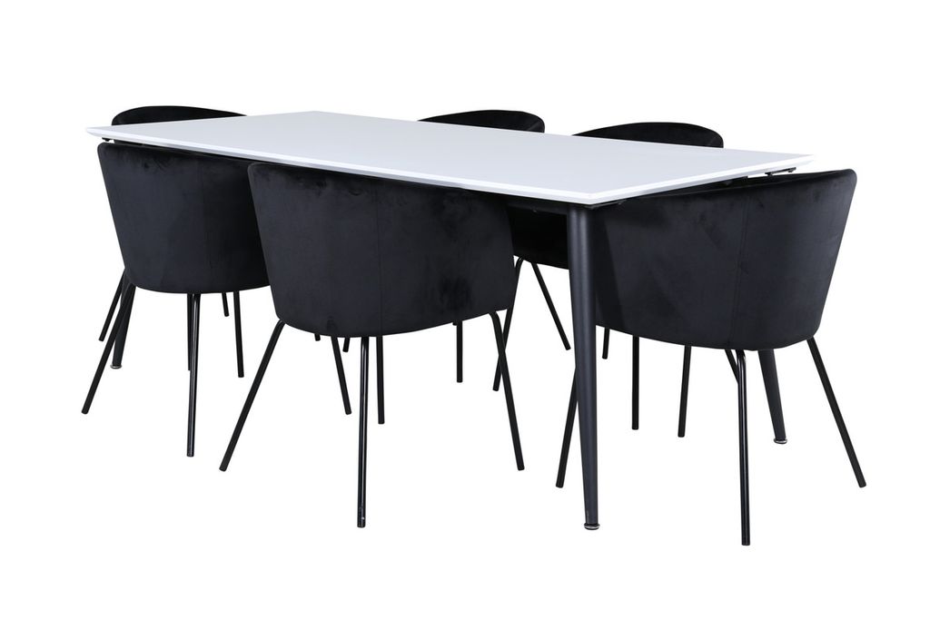 Pampig och elegant matgrupp! Våra populära matstolar Berit i lyxig design förlänger de trivsamma middagsstunderna. Stolen har ett generöst sittdjup med en sits i svart sammet och stilrent smala stolsben i svart järn. Stolens mått: Höjd: 78cm, Sitthöjd: 49cm, Bredd: 55cm, Djup: 55cm. Här matchas 6st matstolar med det klassiska matbordet Jimmy - ett säkert kort för alla tillfällen! Med en förlängningsbar toppskiva i vit HPL och MDF faner och lätt utsvängda ben i svart metall passar det här bordet perfekt till alla inredningsstilar och hem. Bordets mått: Längd förlängningsbart mellan: 195cm och 285cm, Bredd: 90cm, Höjd: 76cm.