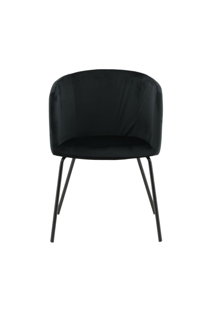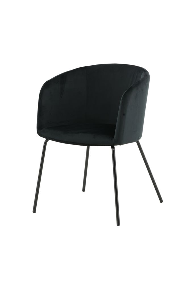 Modern och bekväm svart matstol i sammet med svart järnstomme. Perfekt för stilfulla middagar.