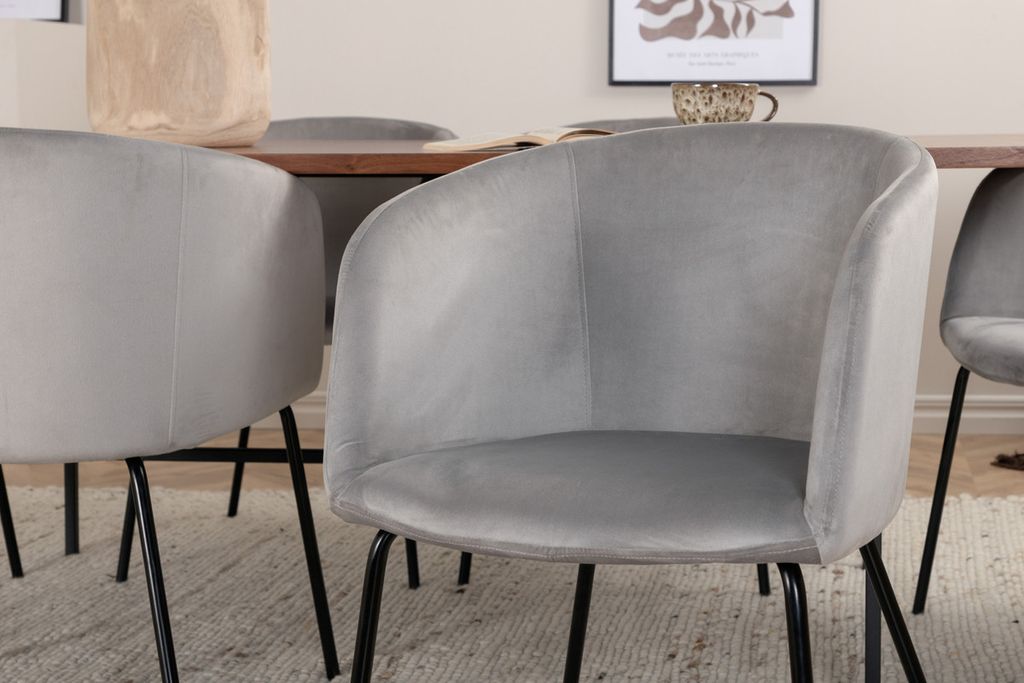 Sjunk ner i den här inbjudande och stilrena matgruppen för långa middagsstunder tillsammans med familj och vänner! Matbord Petra har en genomtänkt design med skandinaviska former som ger en stilren känsla, smala, lätt utsvängda ben i svart järn och en bordsskiva i svart MDF med faner. Bordets mått: Längd: 190cm, Bredd: 90cm, Höjd: 75cm. Här i perfekt kombination med 6st bekväma matstolar från serien Berit. Stolsbenen är i svart järn och den helklädda sitsen i grå sammet som ger ett läckert lyster till rummet. Stolens mått: Höjd: 78cm, Sitthöjd: 49cm, Bredd: 55cm, Djup: 55cm. En lyxig och stilsäker matgrupp som bjuder in till långa middagsstunder!