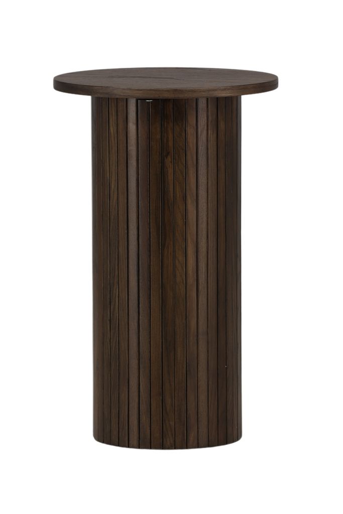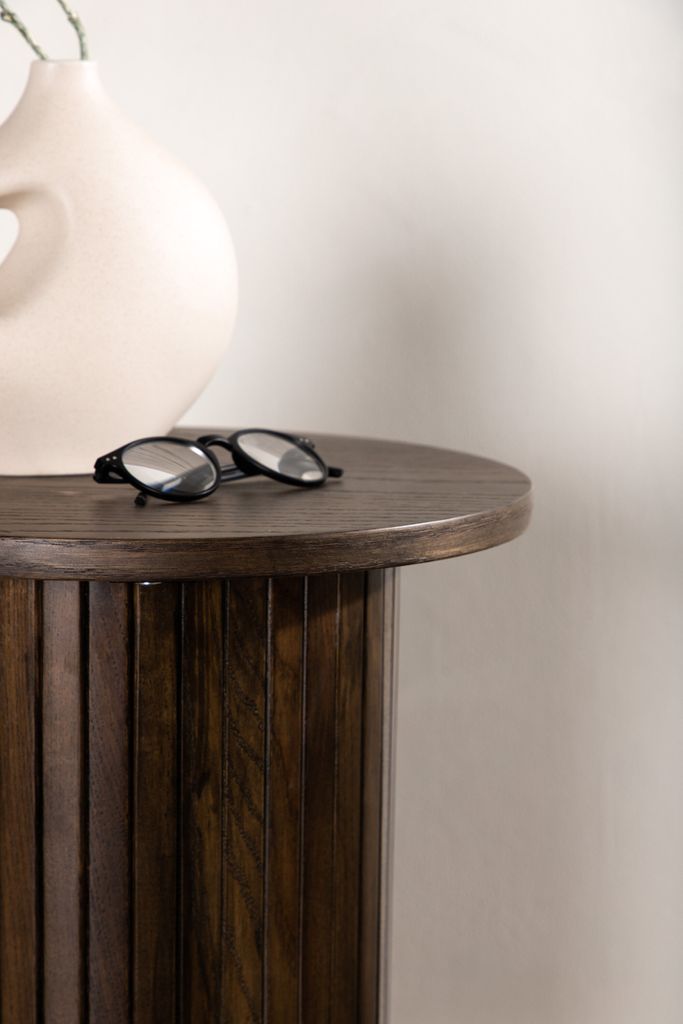 Stilrent sidobord i mocca MDF med skandinavisk design och ribbad cylinderformad stomme.