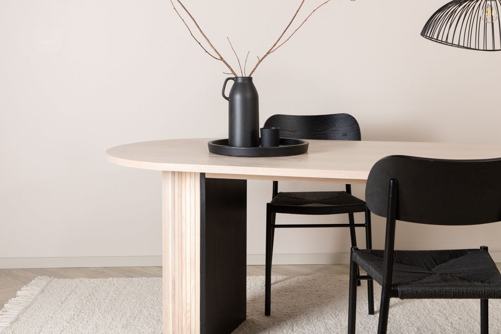 Stilsäkert ovalt bord i vit MDF med ribbad design. Perfekt för moderna hem och trivsamma måltider.