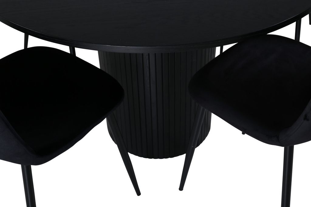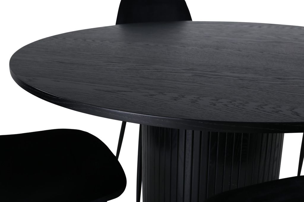 Stilsäkert och elegant - en svart matgrupp är enkel att matcha och går aldrig ur tiden! Kring vårt runda matbord Bianca skapar du en härlig gemenskap där ingen riskerar hamna på kanten. Bordsskivan är tillverkad i MDF och har en cylinderformad stomme i bastant utformning och ribbad design. Den genomgående svarta kulören är lika tidlös som snygg och enkel att matcha med övrig inredning. Bordets mått: Diameter: 110cm, Höjd: 74cm. Kombineras utmärkt med 4st Polar matstolar i svart sammetstyg som ger ett fint lyster och stolsben i metall. Stolens mått: Höjd: 88cm, Sitthöjd: 41,5cm, Bredd: 42,5cm, Djup: 53,3cm.