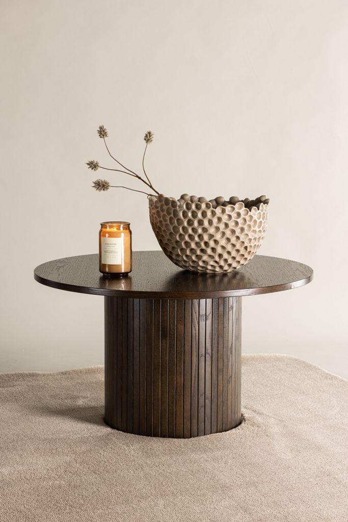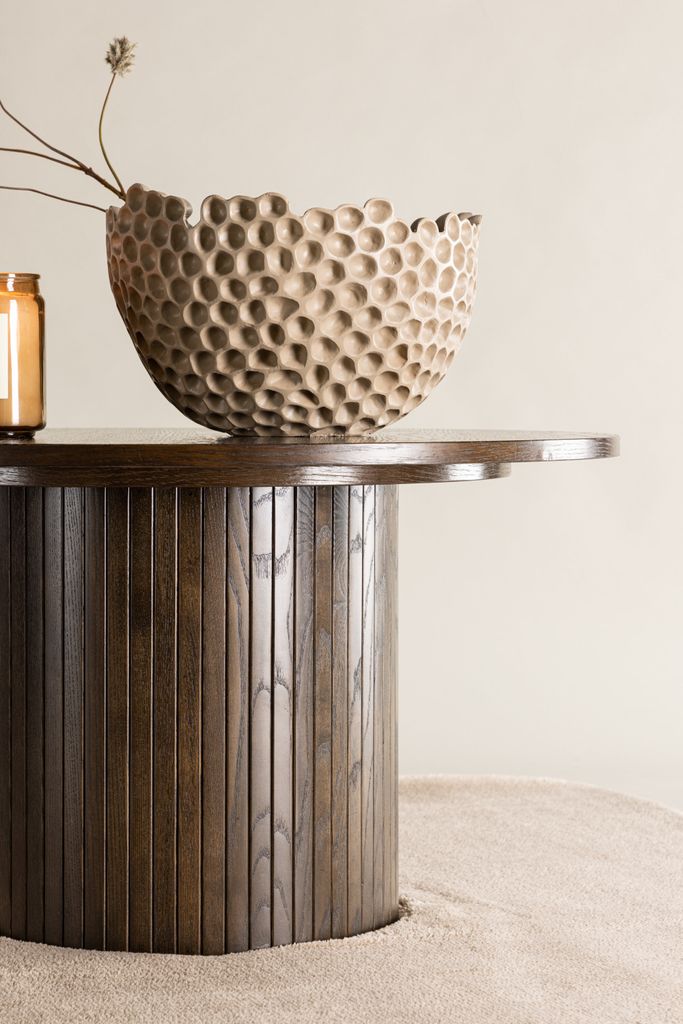 Stilrent och praktiskt soffbord i brun färg med rund design. Perfekt för modern inredning och erbjuder generös yta för dekoration.