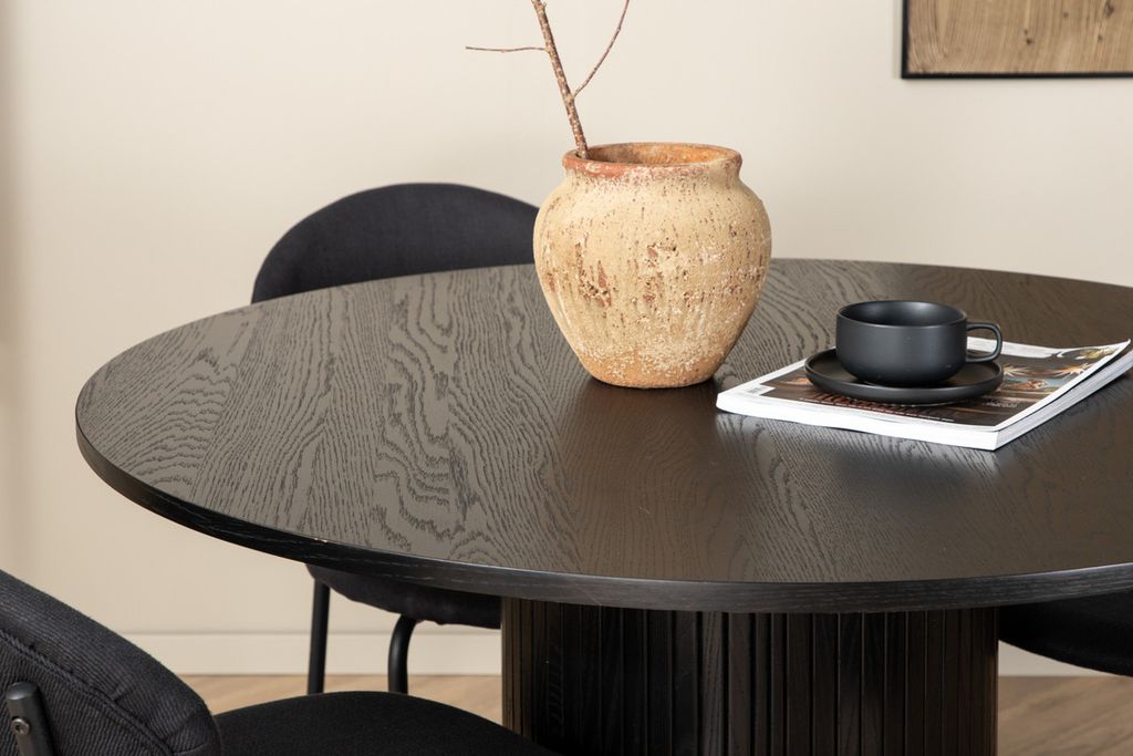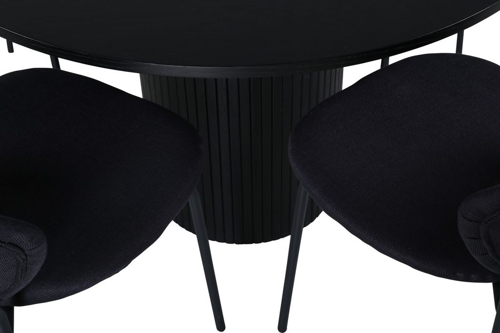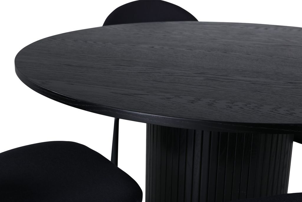 Skapa en härlig gemenskap kring vårt runda matbord Bianca i modemedveten design! Bordsskivan är tillverkad i MDF och har en cylinderformad stomme i robust utformning och ribbad design. Den genomgående svarta kulören är lika tidlös som snygg och enkel att matcha med övrig inredning. Bordets mått: Diameter: 110cm, Höjd: 74cm. Matchas här med 4st Vault matstolar i oval utformning. Stolsbenen är smala i svart metall och sitsen i svart polyester. Stolens mått: Höjd: 80cm, Sitthöjd: 49cm, Bredd: 46cm, Djup: 61,5cm. Låt tiden vid matbordet bli till en av dagens höjdpunkter!