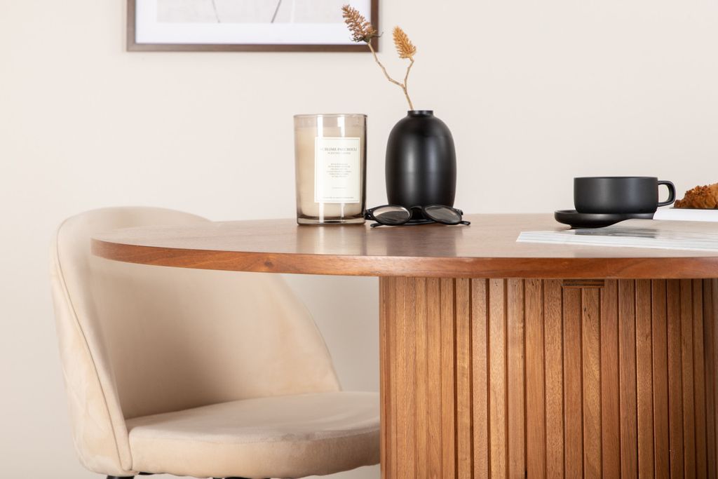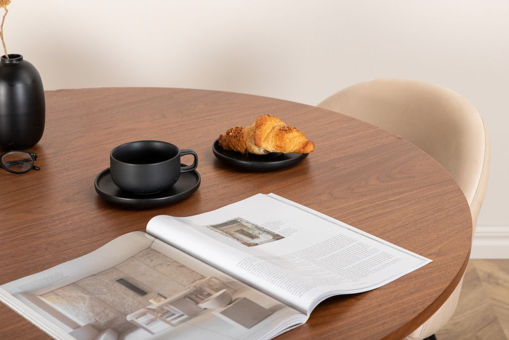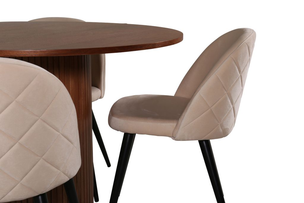 Skapa ett inbjudande blickfång i hemmets hjärta! Vårt runda matbord Bianca i trendig valnötskulör passar perfekt i både vardagsrummet eller det rymliga köket. Bordskivan är valnötsfärgad MDF med faner och stommen robust i valnöt samt svart kulör av trä och MDF i en ribbad design som ger ett stadigt intryck. Här tillsammans med 4st av våra omtyckta matstolar Velvet Stitches som bidrar till en snygg helhet i vardagsrummet. Stolsbenen är lätt utsvängda i svart järn och sammetssitsarna i beige ger ett fint lyster till rummet. Njut av trivsamma måltider!